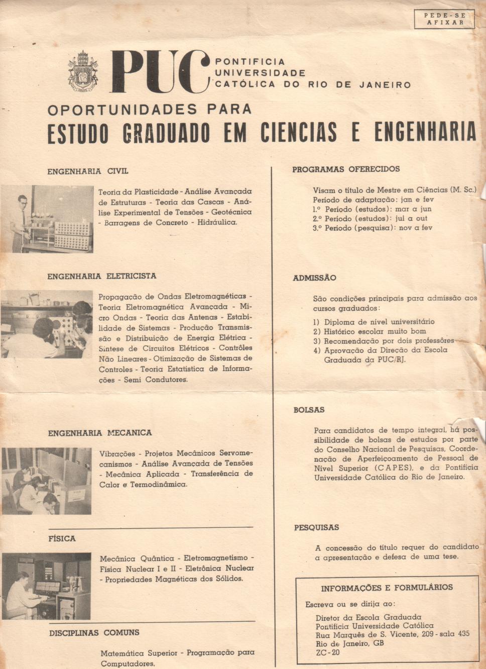 Cartaz sobre as oportunidades para Estudo Graduado em Ciências e Engenharia na PUC-Rio: Engenharia Civil, Engenharia Elétrica, Engenharia Mecânica e Física. Com fotos de laboratórios, do computador Burroughs e a lista das disciplinas específicas e comuns a todas as áreas.