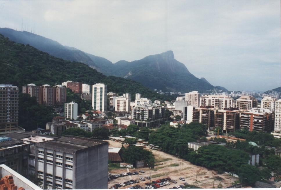 Foto do alto do edifício Cardeal Leme, a partir da varanda do Decanato do CTC. Vista do estacionamento externo, com automóveis e ônibus, o Laboratório de Desenvolvimento de Protótipos do Departamento de Artes. Vista de parte do bairro da Gávea.