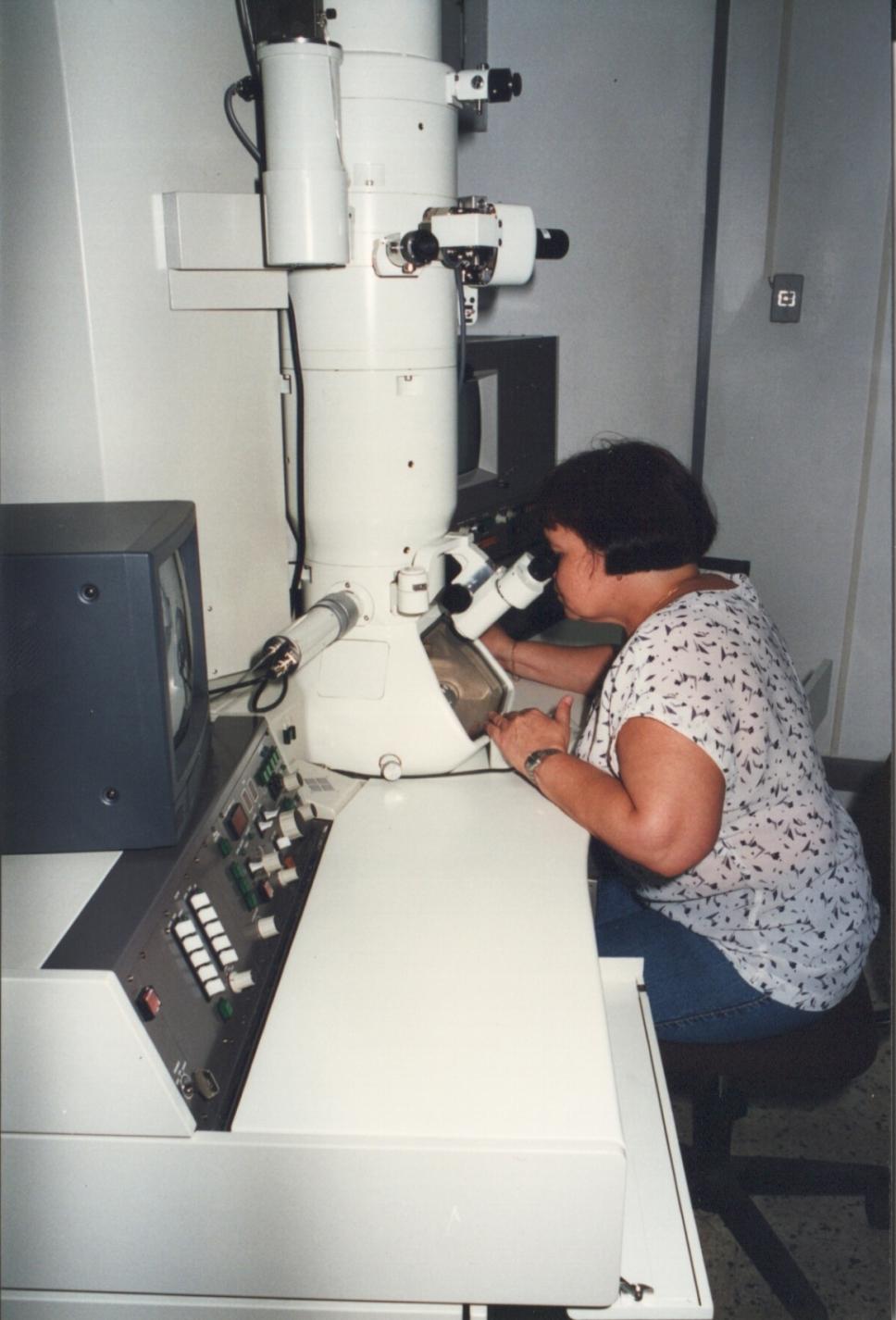 Pessoa opera equipamento em laboratório, através de um microscópio.