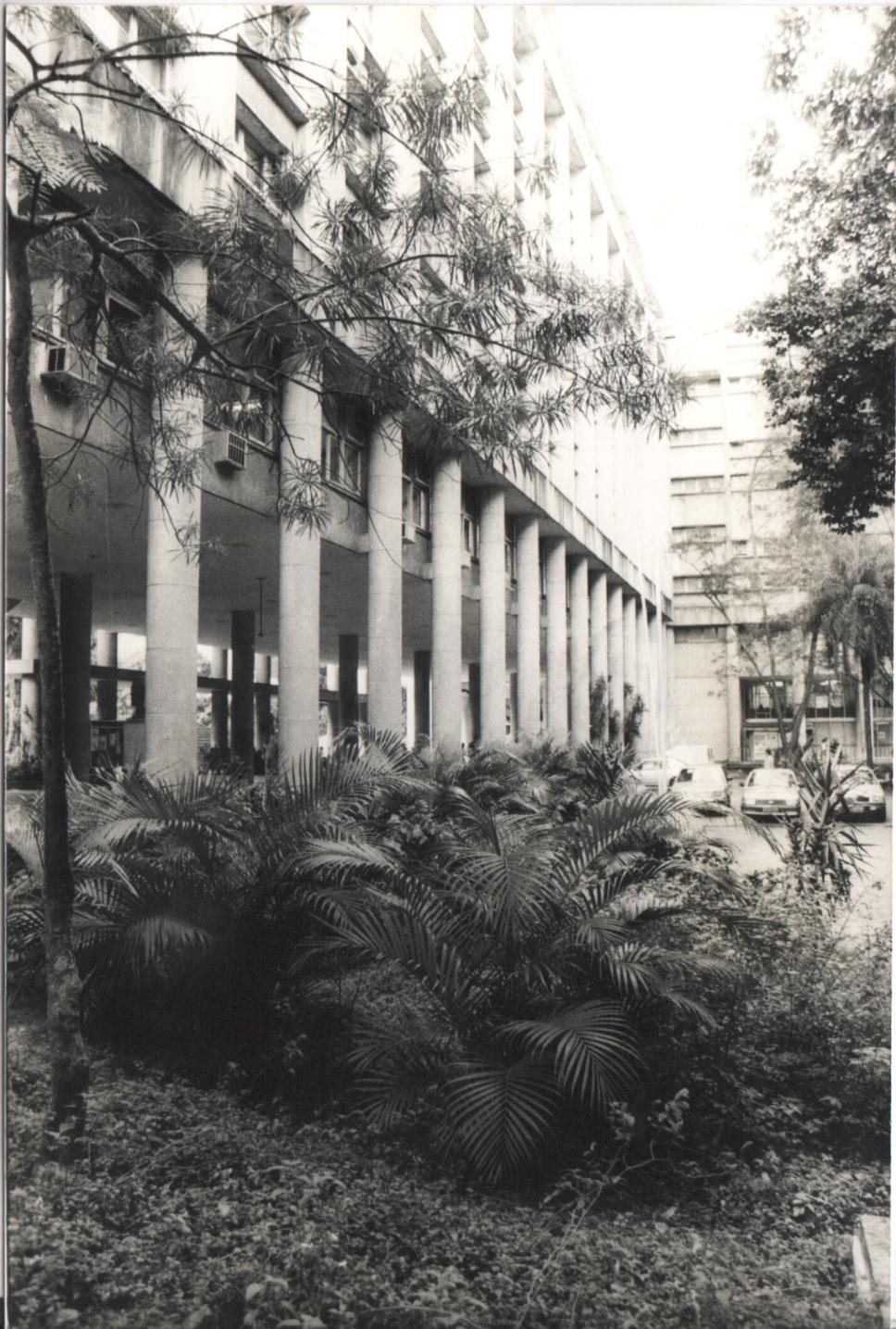 Imagem do campus, provavelmente usada em publicações do Decanato do CTC. Jardim e estacionamento à frente da Ala Kennedy.