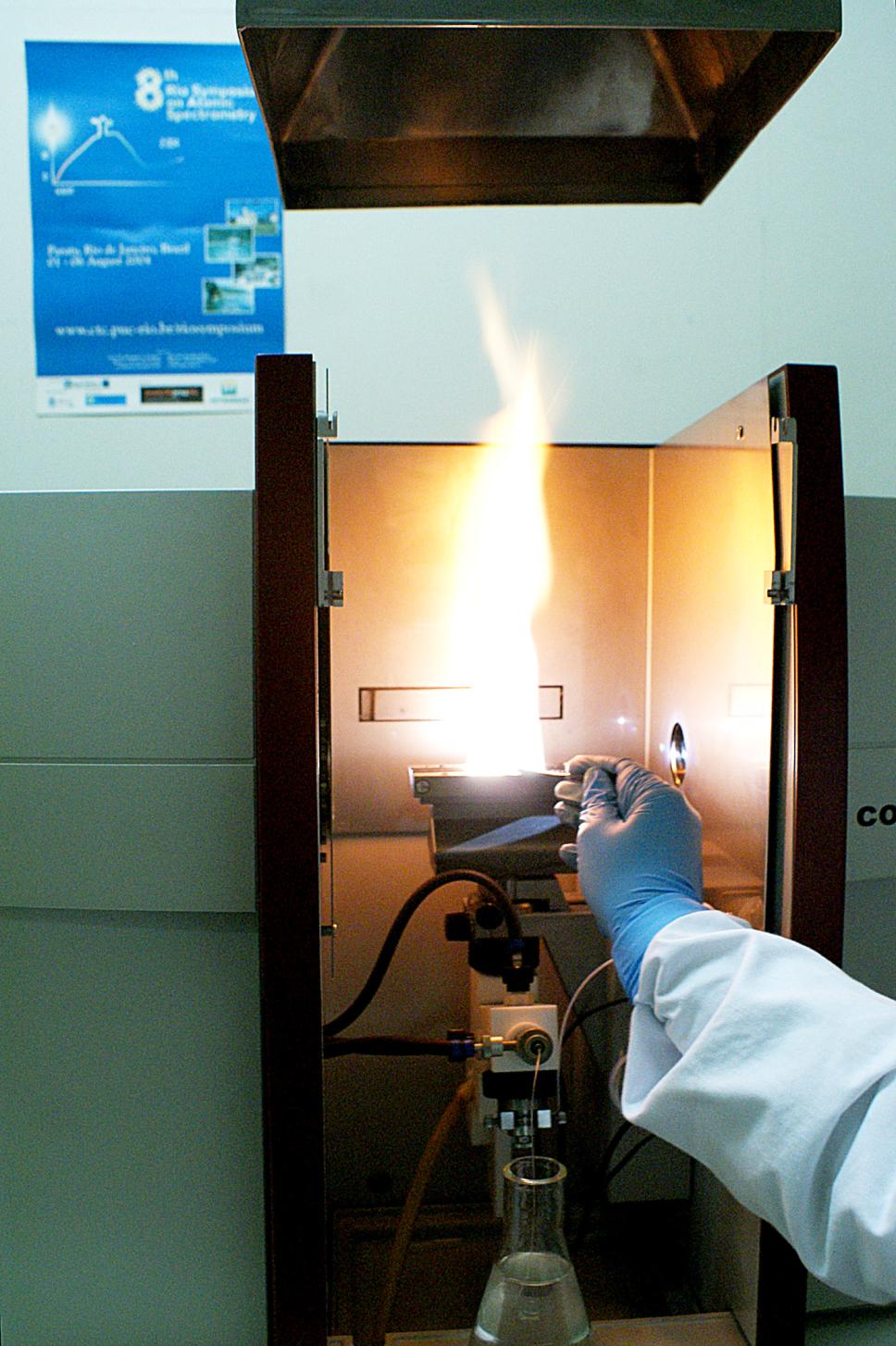 Pessoa opera equipamento em laboratório. Equipamento Analytik Jena ContrAA 300.