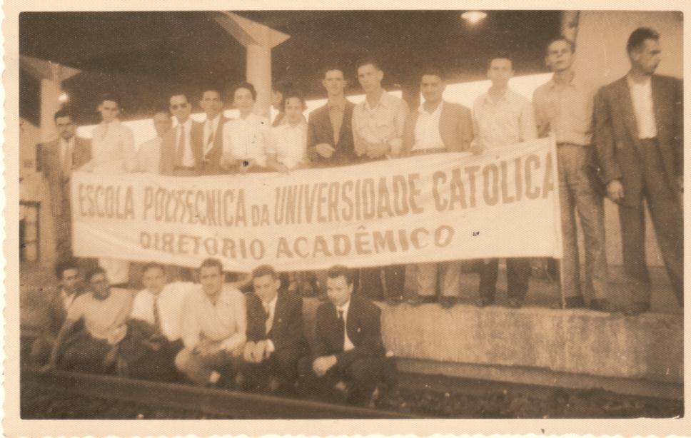 Alunos do Diretório Acadêmico da Escola Politécnica da Universidade Católica, segurando uma faixa, numa estação de trem