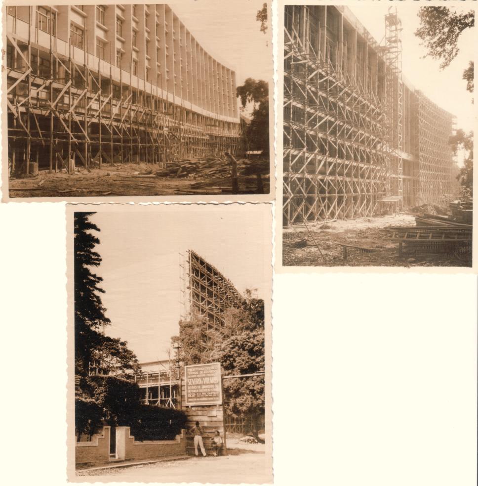 Três fotos reunidas de detalhes da construção do campus Gávea. Vista palo lado do morro aos fundos do atual Ed. Cardeal Leme e vista da atual entrada pela Av. Leonel Franca, na qual há uma placa da empresa construtora Severo e Villares, cujo engenheiro responsável era o prof. Carlos Alberto Del Castillo. Vê-se uma das casas que existiam no limite do terreno do campus.