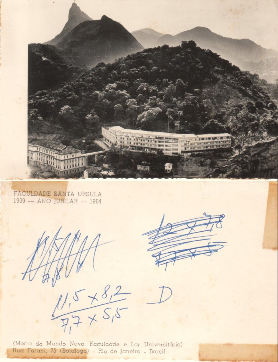 Frente e verso de postal da Faculdade Santa Úrsula: "1939 - Ano Jubilar - 1964 - (Morro do Mundo Novo, Faculdade e Lar Universitário) - Rua Farani, 75". Na foto, os prédios e as montanhas ao fundo, incluindo o Corcovado.