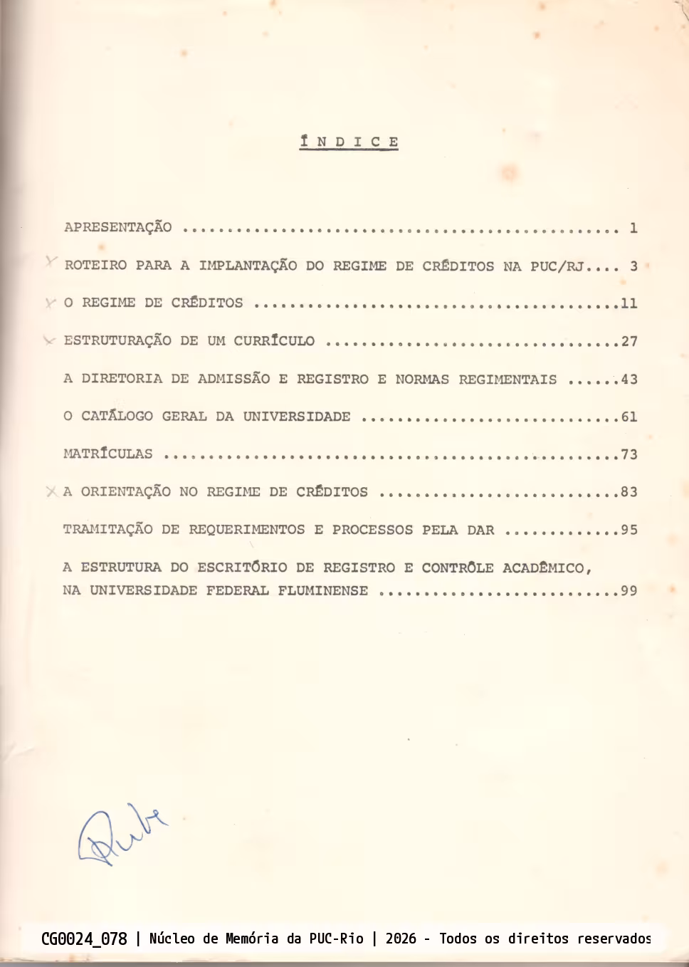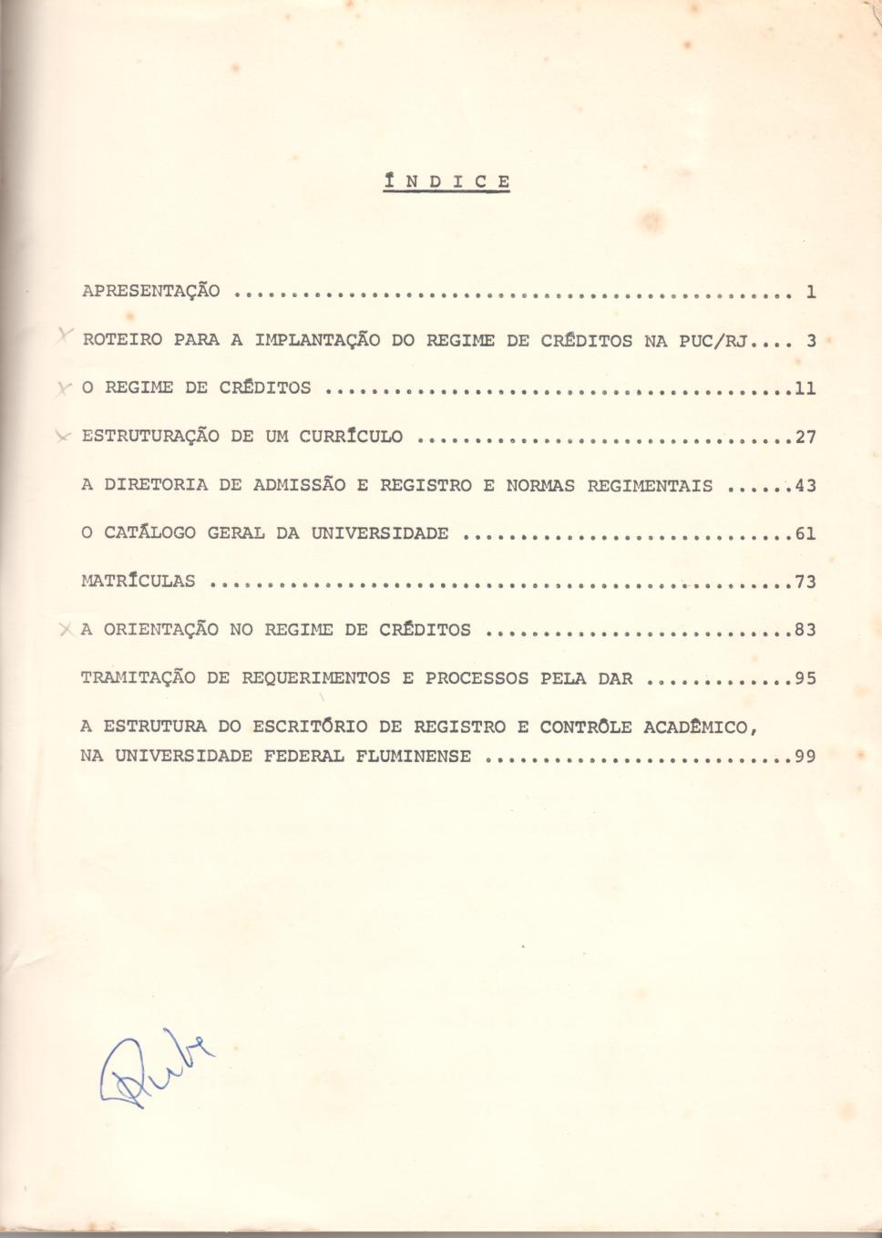 Índice da publicação Treinamento intensivo para administradores de universidades - registro e controle acadêmico. Os trabalhos reunidos na publicação são resumos dos temas apresentados no treinamento realizado com administradores acadêmicos, promovido pelo Conselho de Reitores das Universidades Brasileiras, de 15 a 19 de dezembro de 1969. As produções abordam o processo de implantação do regime de créditos na PUC-Rio, a restruturação curricular, os procedimentos para matrícula, a organização de um novo Catálogo Geral e definição de normas regimentais da Diretoria de Admissão e Registro.