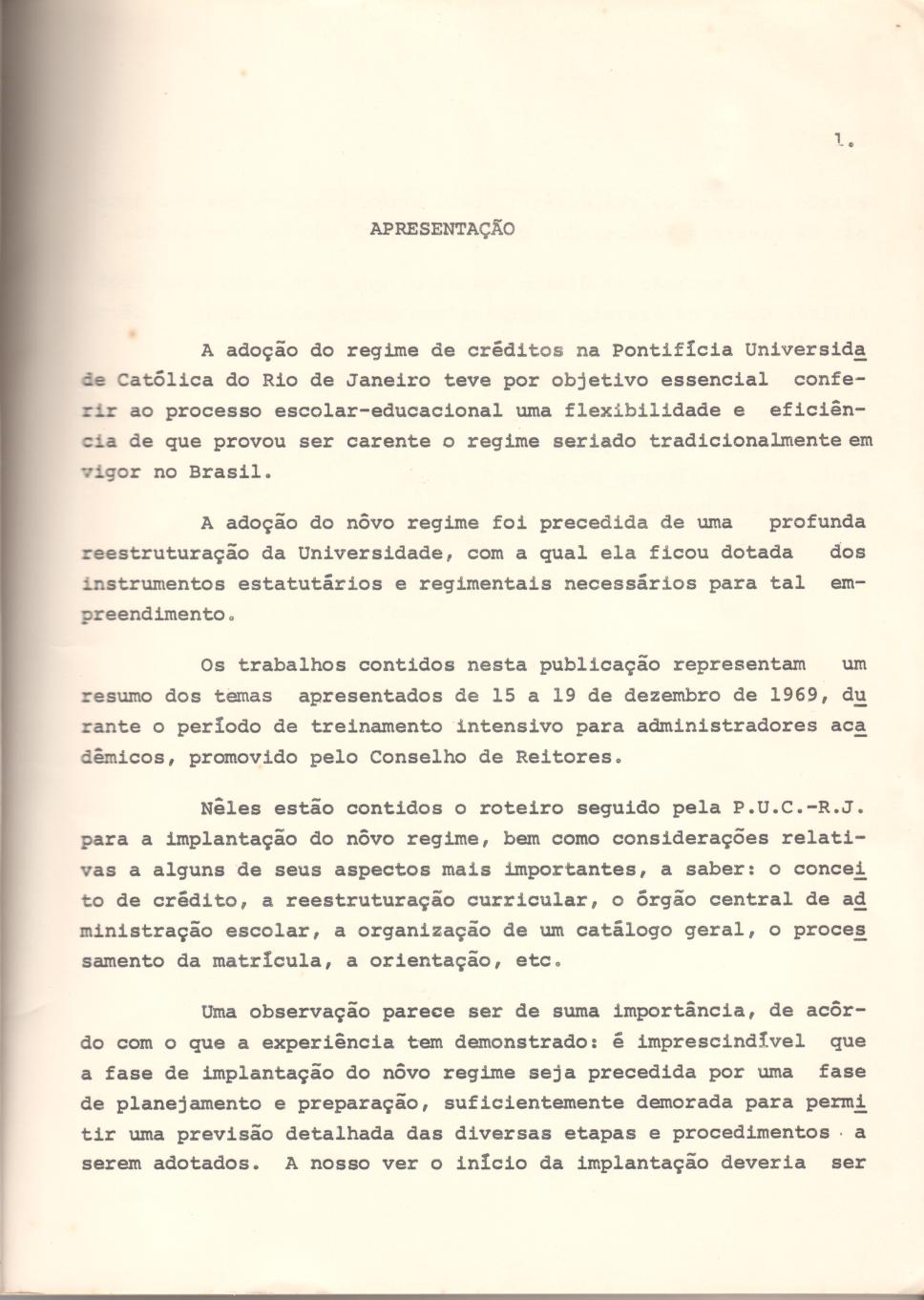 Apresentação da publicação Treinamento intensivo para administradores de universidades - registro e controle acadêmico. Os trabalhos reunidos na publicação são resumos dos temas apresentados no treinamento realizado com administradores acadêmicos, promovido pelo Conselho de Reitores das Universidades Brasileiras, de 15 a 19 de dezembro de 1969. As produções abordam o processo de implantação do regime de créditos na PUC-Rio, a restruturação curricular, os procedimentos para matrícula, a organização de um novo Catálogo Geral e definição de normas regimentais da Diretoria de Admissão e Registro.