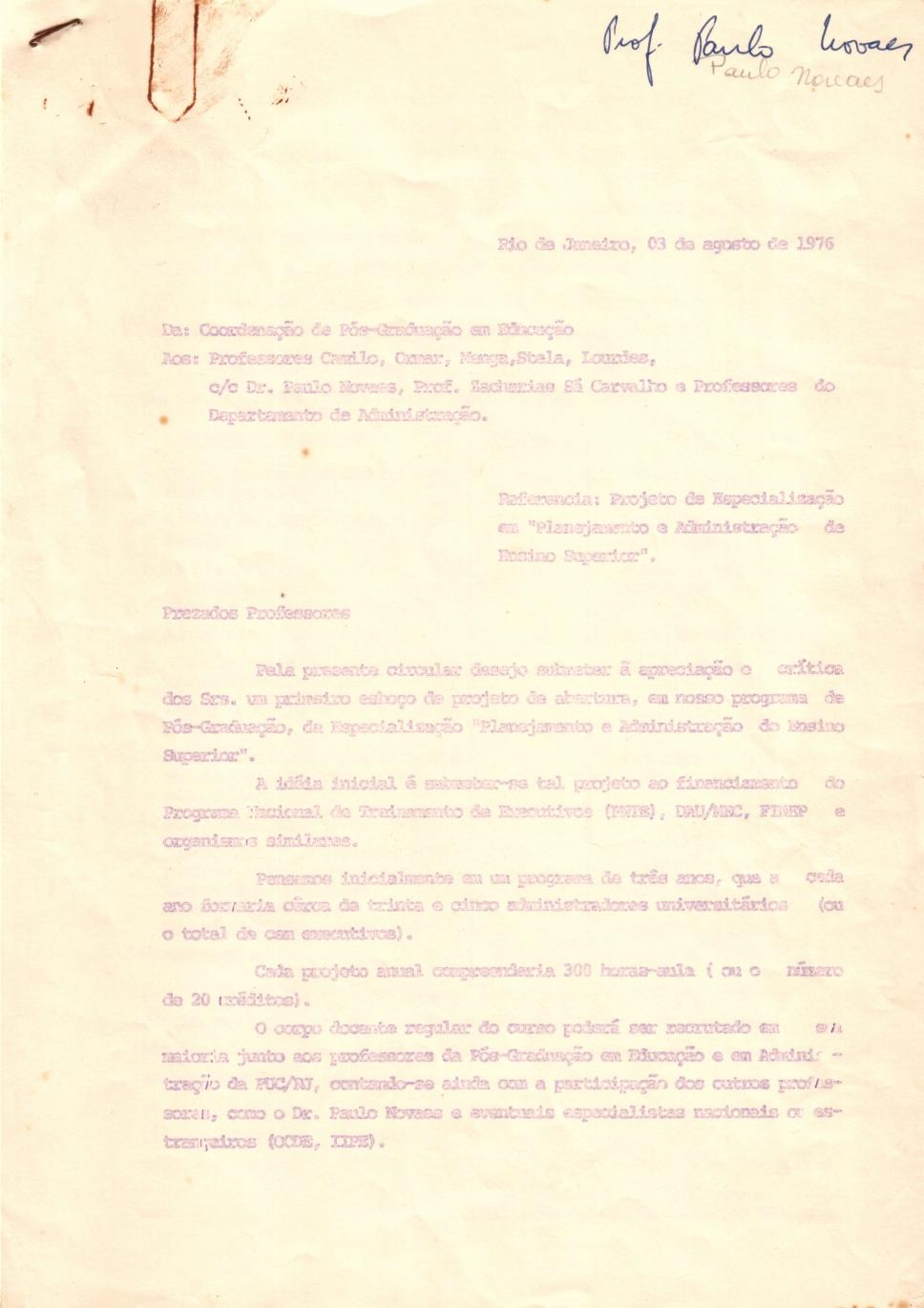 Circular da Coordenação de Pós-Graduação em Educação com o esboço do projeto do novo curso de especialização em Planejamento e Administração de Ensino Superior.