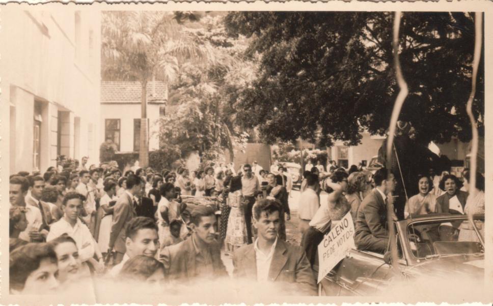 Campanha de uma das chapas à Presidência do DCE encabeçada por Galeno Martins de Almeida (JUR), em frente ao Colégio Santo Inácio, na rua São Clemente, há um cartaz onde se lê "Galeno pede votos".