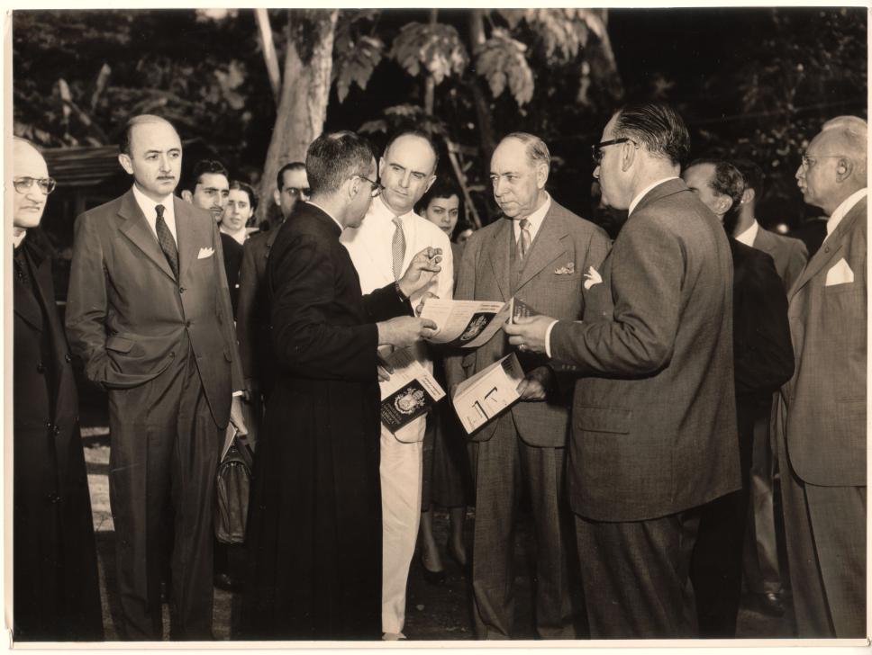 Visita de parlamentares federais e municipais e de membros do Conselho Nacional de Educação às obras do campus da Gávea. Início da campanha para angariar recursos para a construção.