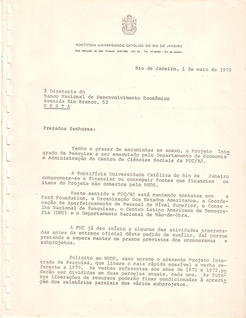 Carta de apresentação assinada pelo reitor pe. Ormindo Viveiros de Castro S.J. sobre o Projeto Integrado de Pesquisa, a ser executado pelos departamentos de Administração e Economia, para solicitar ao Banco Nacional de Desenvolvimento Econômico a liberação de verba para o ano de 1970.