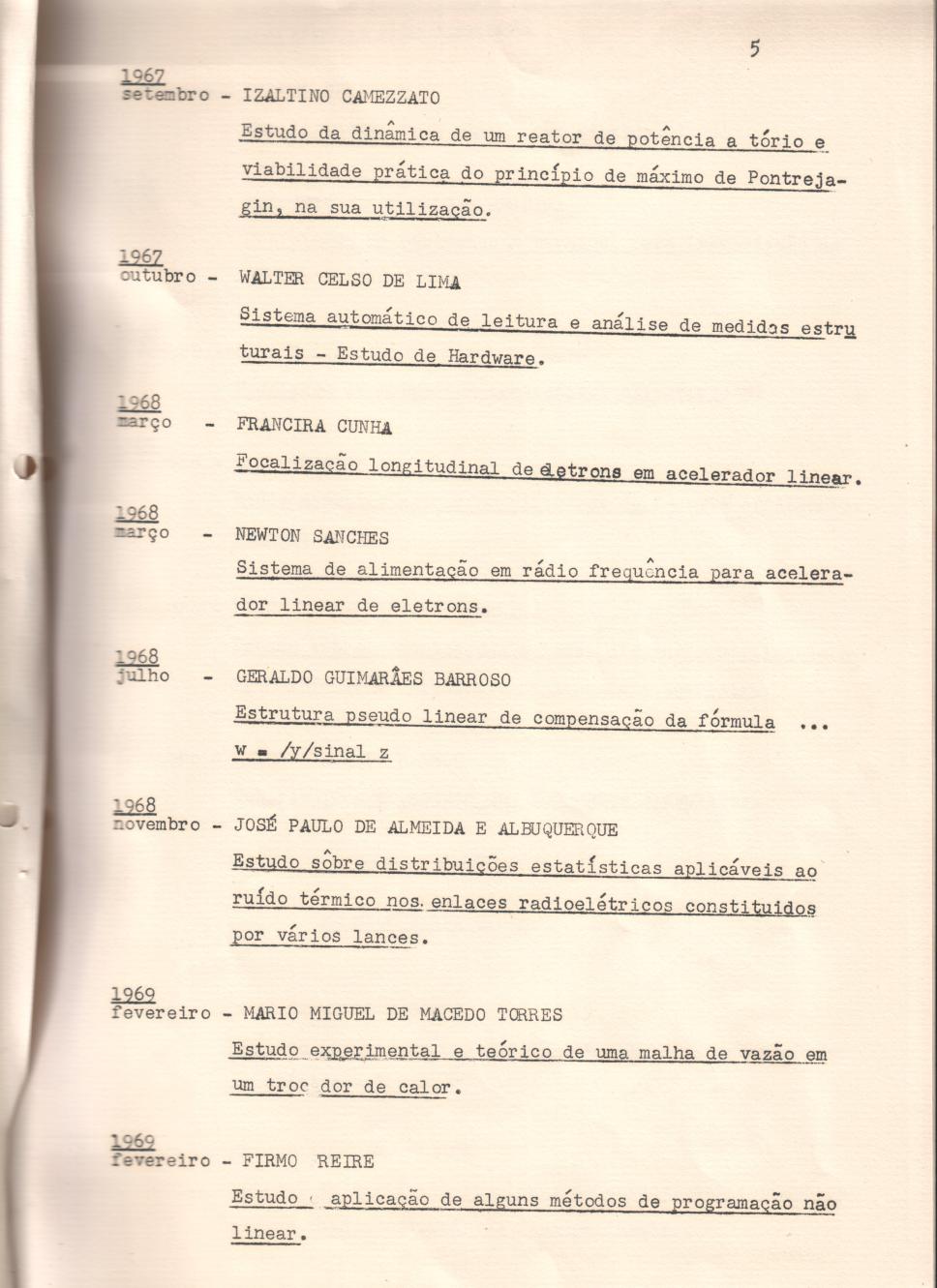 Alunos mestres e doutores citados no Boletim: Laura Chaer (LET), Leonel Correia Pinto (PSI), Maria Helela da Silva Novais (PSI), Miguel Angel Espeche Gil (JUR), Angel Maria Oliveri Lopez (JUR), Helga Sofie Hensoldt (JUR), Carlos Alberto Menezes Direito (JUR), João Mestieri (JUR), Ruth Geerin (GEO), Maria Sonsoles Guerras Martin (GEO), Guilherme M. S. de la Penha (MEC), Fernando de Mello Bouças (MEC), Ramiro de Araújo Almeida Sobrinho (MEC), Dante Altieri (MEC), Victor Prodonoff (MEC), Eduardo Jorge Pereira Lima (MEC), Carlos Silberman (MEC), José João Espíndola (MEC), Sidney Stuckenbruck (MEC), Leonardo Goldstein Júnior (MEC), Diocleciano Arthur de Figueiredo Pegado (ELE), Mauro Soares de Assis (ELE), Amilcar Figueiredo de Aguiar (ELE), Ronaldo Sérgio de Biasi (ELE), Samuel Leo Lewin (ELE), Izaltino Camezzato (ELE), Walter Celso de Lima (ELE), Francira Cunha (ELE), Newton Sanches (ELE), Geraldo Guimarães Barroso (ELE), José Paulo de Almeida e Albuquerque (ELE), Mário Miguel de Macedo Torres (ELE), Firmo Freire (ELE), Aberlardo Podcameni (ELE), Miguel Jonathan (ELE), Tarcísio Jorge Caldas Pereira (ELE), Carlos Lisboa (ELE), Omar Teschke (ELE), Franklin Balassiano Pedreira (ELE), Márcia Machado Rabelo (ELE), Jorge de Mello e Souza (CIV), Erlane Ferreira Soares (CIV), Francisco de Carvalho Martins (CIV), Oussama S. Moukadden (CIV), Plácido Barbosa (CIV), Eduardo Machado Gonçalves (CIV), Walter Otto Cybis (CIV), Regner Reine Castillo (CIV), Flávio Magalhães Veras (IND), Herculano Antônio Pereira Cunha Sobrinho (CIV), Paulo Matos de Lemos (CIV), Claudio José Fernandes de Azevedo (IND), Jorge Arantes Pinto de Abreu (IND), Raul Valentim da Silva (IND), Luiz Carlos Medeiros da Rocha Paes (IND), Carlos Alberto Brandão do Amaral (IND), José Pedro Carvalho de Toledo Piza, Ikuo Kiyohara (IND), Carlos Alkmin Mascaro (IND), Joaquim Dias Galvão Neto (IND), Pedro Paulo Coelho de Souza Bastos (IND), Adalberto José Ramos Campelli (IND), João Paulo Villela de Andrade (IND), Gilson Matheus Carneiro (FIS), Carlos Vieira Barros Leite Filho (FIS), Humberto Siqueira Brandi (FIS), Bruno Maffeo (FIS), Paulo Edmundo L. Costa Ribeiro (FIS), Luiz Cândido Mota Amaral (FIS), Márcio Luiz Vianna (FIS), Rubem Gandelman (FIS), Ethelvina Morillo de Escobar (FIS), Hélio Schecgter (FIS), Antônio Fernando dos Santos Pena (FIS), Ênio Frota da Silveira (FIS), Rafael Crisóstomo Barbosa da Silva (INF), Arndt von Staa (INF), Simão Sirineo Toscani (INF); boletim completo nos metadados: cg0028_001 a cg0028_011.