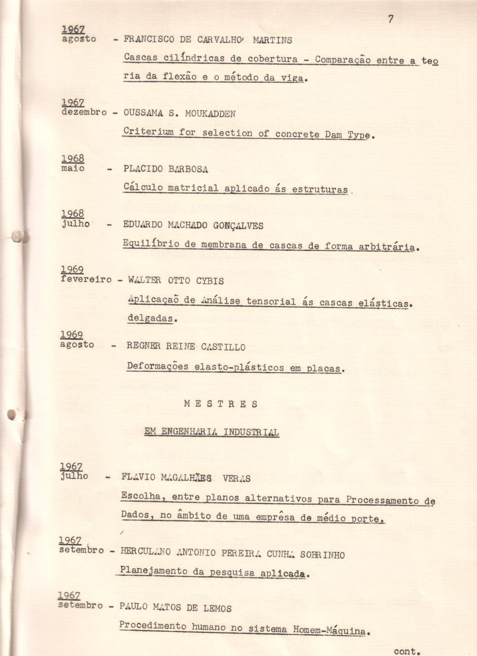 Alunos mestres e doutores citados no Boletim: Laura Chaer (LET), Leonel Correia Pinto (PSI), Maria Helela da Silva Novais (PSI), Miguel Angel Espeche Gil (JUR), Angel Maria Oliveri Lopez (JUR), Helga Sofie Hensoldt (JUR), Carlos Alberto Menezes Direito (JUR), João Mestieri (JUR), Ruth Geerin (GEO), Maria Sonsoles Guerras Martin (GEO), Guilherme M. S. de la Penha (MEC), Fernando de Mello Bouças (MEC), Ramiro de Araújo Almeida Sobrinho (MEC), Dante Altieri (MEC), Victor Prodonoff (MEC), Eduardo Jorge Pereira Lima (MEC), Carlos Silberman (MEC), José João Espíndola (MEC), Sidney Stuckenbruck (MEC), Leonardo Goldstein Júnior (MEC), Diocleciano Arthur de Figueiredo Pegado (ELE), Mauro Soares de Assis (ELE), Amilcar Figueiredo de Aguiar (ELE), Ronaldo Sérgio de Biasi (ELE), Samuel Leo Lewin (ELE), Izaltino Camezzato (ELE), Walter Celso de Lima (ELE), Francira Cunha (ELE), Newton Sanches (ELE), Geraldo Guimarães Barroso (ELE), José Paulo de Almeida e Albuquerque (ELE), Mário Miguel de Macedo Torres (ELE), Firmo Freire (ELE), Aberlardo Podcameni (ELE), Miguel Jonathan (ELE), Tarcísio Jorge Caldas Pereira (ELE), Carlos Lisboa (ELE), Omar Teschke (ELE), Franklin Balassiano Pedreira (ELE), Márcia Machado Rabelo (ELE), Jorge de Mello e Souza (CIV), Erlane Ferreira Soares (CIV), Francisco de Carvalho Martins (CIV), Oussama S. Moukadden (CIV), Plácido Barbosa (CIV), Eduardo Machado Gonçalves (CIV), Walter Otto Cybis (CIV), Regner Reine Castillo (CIV), Flávio Magalhães Veras (IND), Herculano Antônio Pereira Cunha Sobrinho (CIV), Paulo Matos de Lemos (CIV), Claudio José Fernandes de Azevedo (IND), Jorge Arantes Pinto de Abreu (IND), Raul Valentim da Silva (IND), Luiz Carlos Medeiros da Rocha Paes (IND), Carlos Alberto Brandão do Amaral (IND), José Pedro Carvalho de Toledo Piza, Ikuo Kiyohara (IND), Carlos Alkmin Mascaro (IND), Joaquim Dias Galvão Neto (IND), Pedro Paulo Coelho de Souza Bastos (IND), Adalberto José Ramos Campelli (IND), João Paulo Villela de Andrade (IND), Gilson Matheus Carneiro (FIS), Carlos Vieira Barros Leite Filho (FIS), Humberto Siqueira Brandi (FIS), Bruno Maffeo (FIS), Paulo Edmundo L. Costa Ribeiro (FIS), Luiz Cândido Mota Amaral (FIS), Márcio Luiz Vianna (FIS), Rubem Gandelman (FIS), Ethelvina Morillo de Escobar (FIS), Hélio Schecgter (FIS), Antônio Fernando dos Santos Pena (FIS), Ênio Frota da Silveira (FIS), Rafael Crisóstomo Barbosa da Silva (INF), Arndt von Staa (INF), Simão Sirineo Toscani (INF); boletim completo nos metadados: cg0028_001 a cg0028_011.