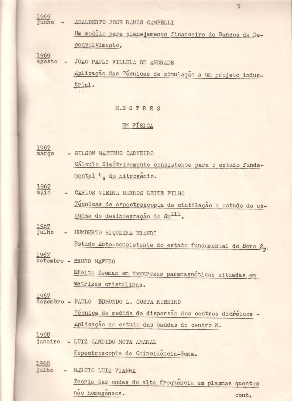 Alunos mestres e doutores citados no Boletim: Laura Chaer (LET), Leonel Correia Pinto (PSI), Maria Helela da Silva Novais (PSI), Miguel Angel Espeche Gil (JUR), Angel Maria Oliveri Lopez (JUR), Helga Sofie Hensoldt (JUR), Carlos Alberto Menezes Direito (JUR), João Mestieri (JUR), Ruth Geerin (GEO), Maria Sonsoles Guerras Martin (GEO), Guilherme M. S. de la Penha (MEC), Fernando de Mello Bouças (MEC), Ramiro de Araújo Almeida Sobrinho (MEC), Dante Altieri (MEC), Victor Prodonoff (MEC), Eduardo Jorge Pereira Lima (MEC), Carlos Silberman (MEC), José João Espíndola (MEC), Sidney Stuckenbruck (MEC), Leonardo Goldstein Júnior (MEC), Diocleciano Arthur de Figueiredo Pegado (ELE), Mauro Soares de Assis (ELE), Amilcar Figueiredo de Aguiar (ELE), Ronaldo Sérgio de Biasi (ELE), Samuel Leo Lewin (ELE), Izaltino Camezzato (ELE), Walter Celso de Lima (ELE), Francira Cunha (ELE), Newton Sanches (ELE), Geraldo Guimarães Barroso (ELE), José Paulo de Almeida e Albuquerque (ELE), Mário Miguel de Macedo Torres (ELE), Firmo Freire (ELE), Aberlardo Podcameni (ELE), Miguel Jonathan (ELE), Tarcísio Jorge Caldas Pereira (ELE), Carlos Lisboa (ELE), Omar Teschke (ELE), Franklin Balassiano Pedreira (ELE), Márcia Machado Rabelo (ELE), Jorge de Mello e Souza (CIV), Erlane Ferreira Soares (CIV), Francisco de Carvalho Martins (CIV), Oussama S. Moukadden (CIV), Plácido Barbosa (CIV), Eduardo Machado Gonçalves (CIV), Walter Otto Cybis (CIV), Regner Reine Castillo (CIV), Flávio Magalhães Veras (IND), Herculano Antônio Pereira Cunha Sobrinho (CIV), Paulo Matos de Lemos (CIV), Claudio José Fernandes de Azevedo (IND), Jorge Arantes Pinto de Abreu (IND), Raul Valentim da Silva (IND), Luiz Carlos Medeiros da Rocha Paes (IND), Carlos Alberto Brandão do Amaral (IND), José Pedro Carvalho de Toledo Piza, Ikuo Kiyohara (IND), Carlos Alkmin Mascaro (IND), Joaquim Dias Galvão Neto (IND), Pedro Paulo Coelho de Souza Bastos (IND), Adalberto José Ramos Campelli (IND), João Paulo Villela de Andrade (IND), Gilson Matheus Carneiro (FIS), Carlos Vieira Barros Leite Filho (FIS), Humberto Siqueira Brandi (FIS), Bruno Maffeo (FIS), Paulo Edmundo L. Costa Ribeiro (FIS), Luiz Cândido Mota Amaral (FIS), Márcio Luiz Vianna (FIS), Rubem Gandelman (FIS), Ethelvina Morillo de Escobar (FIS), Hélio Schecgter (FIS), Antônio Fernando dos Santos Pena (FIS), Ênio Frota da Silveira (FIS), Rafael Crisóstomo Barbosa da Silva (INF), Arndt von Staa (INF), Simão Sirineo Toscani (INF); boletim completo nos metadados: cg0028_001 a cg0028_011.