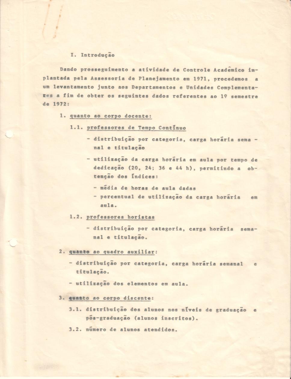 Relatório 09/72 referente às atividades de ensino do primeiro semestre de 1972 na PUC-Rio. O documento traz informações do corpo docente, da produtividade de ensino por Centro, da titulação dos professores, do número de disciplinas e turmas oferecidas, e do número de alunos por centro e por curso. O relatório traz no Anexo III dados do corpo docente, do número de disciplinas e de turmas dos departamentos de Educação, Filosofia, Letras, Psicologia, Teologia, Ciências Jurídicas, Comunicação Social, Economia, História, Geografia, Serviço Social, Sociologia, Física, Informática, Matemática, Química, Engenharia de Metalurgia, Engenharia Civil, Engenharia Elétrica, Engenharia Mecânica, Engenharia Industrial e do CETUC. Há ainda os anexos IV, um quadro comparativo com informações do número de alunos e de aulas por curso, e o V com dados da média de aulas por Centro e por departamentos.