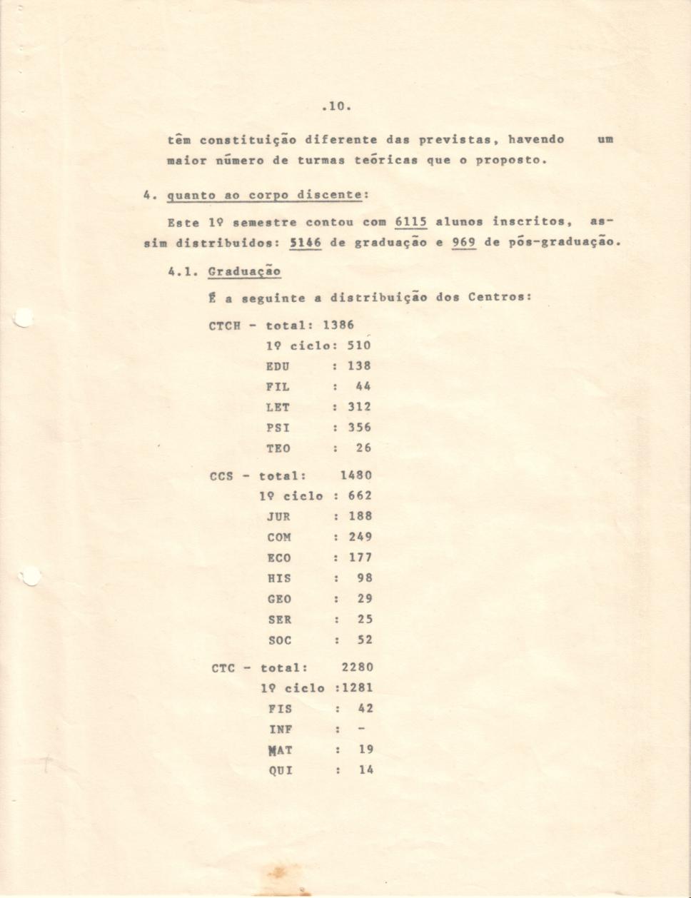 Relatório 09/72 referente às atividades de ensino do primeiro semestre de 1972 na PUC-Rio. O documento traz informações do corpo docente, da produtividade de ensino por Centro, da titulação dos professores, do número de disciplinas e turmas oferecidas, e do número de alunos por centro e por curso. O relatório traz no Anexo III dados do corpo docente, do número de disciplinas e de turmas dos departamentos de Educação, Filosofia, Letras, Psicologia, Teologia, Ciências Jurídicas, Comunicação Social, Economia, História, Geografia, Serviço Social, Sociologia, Física, Informática, Matemática, Química, Engenharia de Metalurgia, Engenharia Civil, Engenharia Elétrica, Engenharia Mecânica, Engenharia Industrial e do CETUC. Há ainda os anexos IV, um quadro comparativo com informações do número de alunos e de aulas por curso, e o V com dados da média de aulas por Centro e por departamentos.