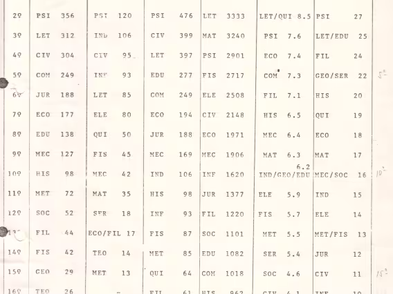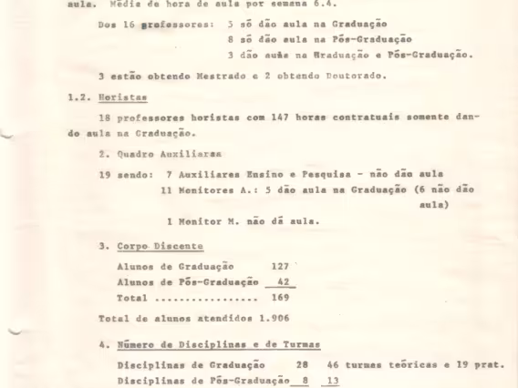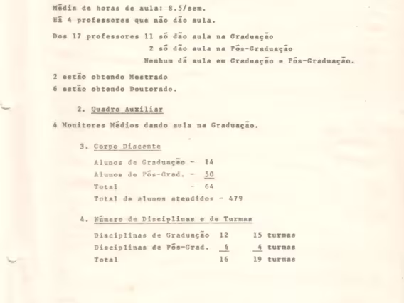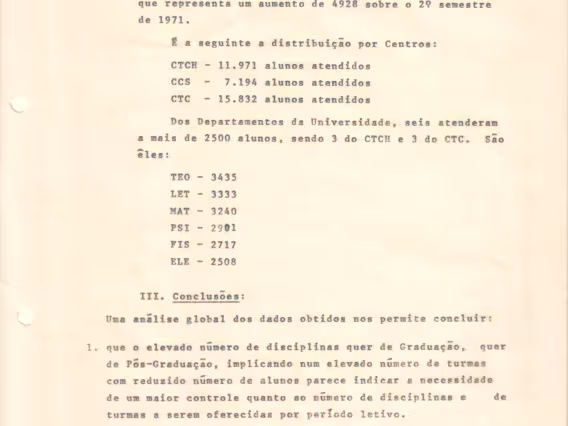 Relatório 09/72 referente às atividades de ensino do primeiro semestre de 1972 na PUC-Rio. O documento traz informações do corpo docente, da produtividade de ensino por Centro, da titulação dos professores, do número de disciplinas e turmas oferecidas, e do número de alunos por centro e por curso. O relatório traz no Anexo III dados do corpo docente, do número de disciplinas e de turmas dos departamentos de Educação, Filosofia, Letras, Psicologia, Teologia, Ciências Jurídicas, Comunicação Social, Economia, História, Geografia, Serviço Social, Sociologia, Física, Informática, Matemática, Química, Engenharia de Metalurgia, Engenharia Civil, Engenharia Elétrica, Engenharia Mecânica, Engenharia Industrial e do CETUC. Há ainda os anexos IV, um quadro comparativo com informações do número de alunos e de aulas por curso, e o V com dados da média de aulas por Centro e por departamentos.