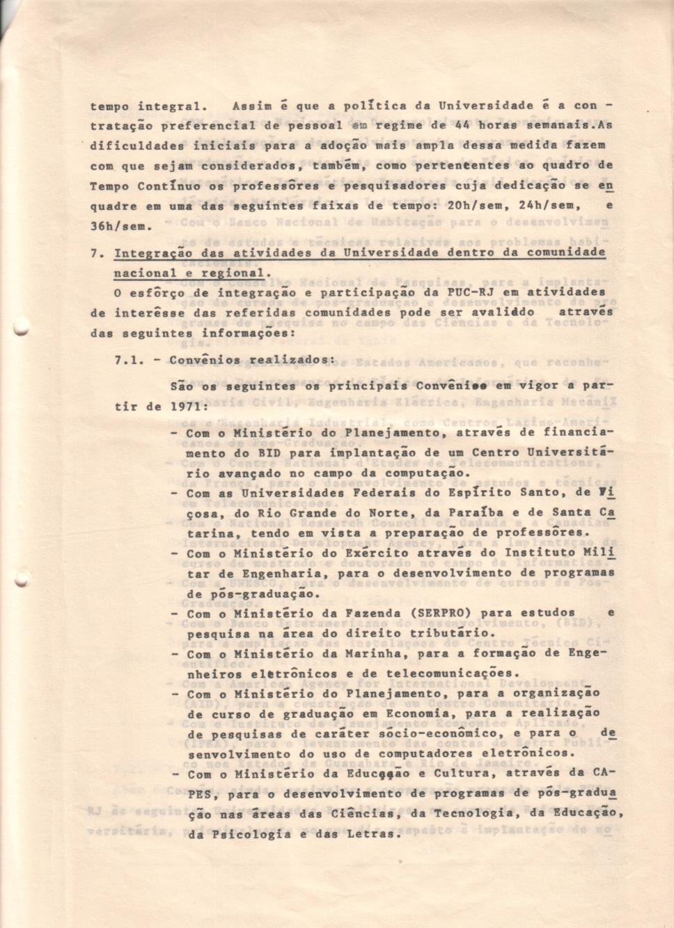 Relatório sem título e autoria com um balanço da Reforma Universitária realizada pela PUC-Rio em 1968. Destaca a reformulação do sistema de ensino em primeiro ciclo, nível profissional e Pós-Graduação; a adoção do regime de créditos; a implantação do sistema regular de orientação aos alunos; a implantação e expansão do ensino de Pós-Graduação e da pesquisa; e a política de contratação de professores de tempo contínuo. Contém ainda listagem dos convênios em vigência na PUC-Rio em 1971 e a relação das universidades brasileiras nas quais a PUC-Rio cooperou para a implantação de novos métodos de administração escolar, a partir da experiência da Universidade com a reforma universitária. Ao final, o relatório traz quadros com números totais de alunos da Graduação e da Pós-graduação por centro de 1971 e 1972; número total de professores de tempo contínuo e horistas por centro de 1972; número de alunos matriculados de 1941 a 1972; e os valores das despesas orçamentárias da Universidade em 1972.