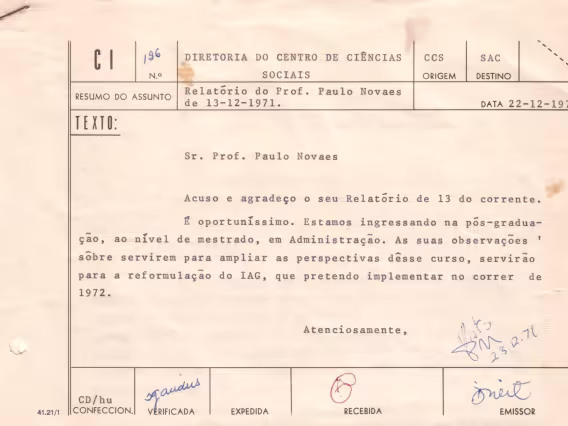 Relatório do prof. Paulo Novaes a respeito da viagem que realizou a instituições de ensino em três países, Colômbia, Peru e Argentina, como consultor do Programa das Nações Unidas para o Desenvolvimento (PNUD) para trazer sugestões para o aperfeiçoamento do sistema de bolsas de estudo no estrangeiro, oferecidas pelas Nações Unidas, nas áreas de administração e gerência técnica. Há um papel datilografado grapeado na frente do relatório da Diretoria do Centro de Ciências Sociais que comunica que as informações do relatório servirão para o processo de criação do Mestrado em Administração e a reformulação do IAG no decorrer do ano de 1972.
