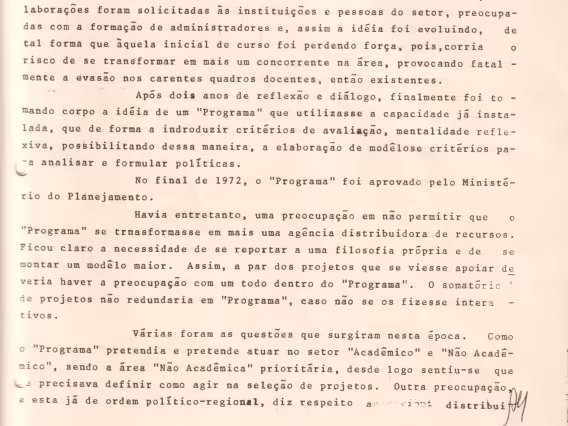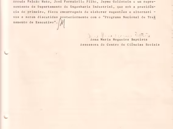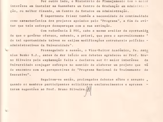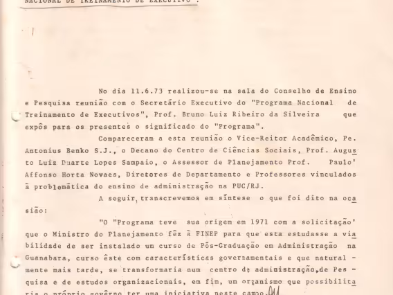 Ata da reunião com o Secretário Executivo do Programa Nacional de Treinamento de Executivos, prof. Bruno Luiz Ribeiro da Silveira, que contou com a participação do Vice-reitor para Assuntos Acadêmicos pe. Antonius Benkö S.J., do Decano do CCS, prof. Augusto Sampaio, do Assessor de Planejamento, prof. Paulo Novaes, e de diretores e professores da área de administração. Na pauta a implantação do curso de Pós-Graduação em Administração na Guanabara, solicitação do Ministério do Planejamento à FINEP, para ser um centro de administração, pesquisa e estudos organizacionais. O prof. Bruno assinala em ata que o programa foi aprovado pelo Ministério do Planejamento no final de 1972, mas com a preocupação de não ser "mais uma agência distribuidora de recursos" e que a atuação fosse prioritariamente na área "não-acadêmica". Ele reafirma também o interesse em instalar na Guanabara um Centro de Estudos em Administração e solicitou que a PUC-Rio avaliasse a proposta que o governo oferece "sabendo, a priori, que para o aproveitamento de tal oportunidade talvez se exijam modificações estruturais político-administrativas da Universidade". O pe. Antonius Benkö S.J. comentou "ser do maior interesse da Universidade conjugar esforços no sentido de elaborar um projeto que vá de encontro com as perspectivas" do Programa Nacional de Treinamento de Executivos e afirmou que coordenará uma comissão formada por professores para elaborar sugestões e alternativas.