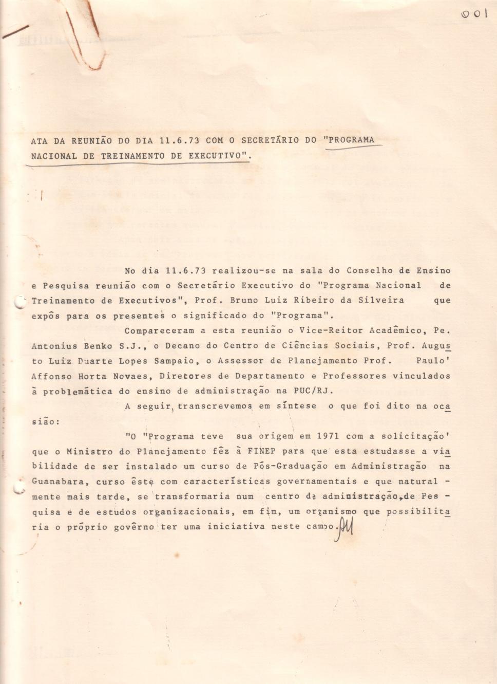 Ata da reunião com o Secretário Executivo do Programa Nacional de Treinamento de Executivos, prof. Bruno Luiz Ribeiro da Silveira, que contou com a participação do Vice-reitor Acadêmico pe. Antonius Benkö S.J., do Decano do CCS, prof. Augusto Sampaio, do Assessor de Planejamento, prof. Paulo Novaes, e de diretores e professores da área de administração. Na pauta a implantação do curso de Pós-Graduação em Administração na Guanabara, solicitação do Ministério do Planejamento à FINEP, para ser um centro de administração, pesquisa e estudos organizacionais. O prof. Bruno assinala em ata que o programa foi aprovado pelo Ministério do Planejamento no final de 1972, mas com a preocupação de não ser "mais uma agência distribuidora de recursos" e que a atuação fosse prioritariamente na área "não-acadêmica". Ele reafirma também o interesse em instalar na Guanabara um Centro de Estudos em Administração e solicitou que a PUC-Rio avaliasse a proposta que o governo oferece "sabendo, a priori, que para o aproveitamento de tal oportunidade talvez se exijam modificações estruturais político-administrativas da Universidade". O pe. Antonius Benkö S.J. comentou "ser do maior interesse da Universidade conjugar esforços no sentido de elaborar um projeto que vá de encontro com as perspectivas" do Programa Nacional de Treinamento de Executivos e afirmou que coordenará uma comissão formada por professores para elaborar sugestões e alternativas.