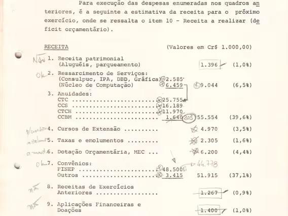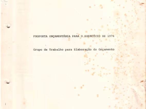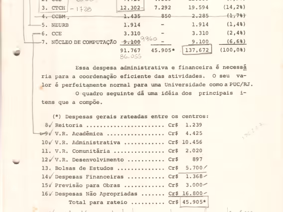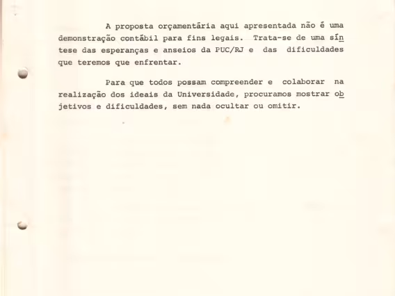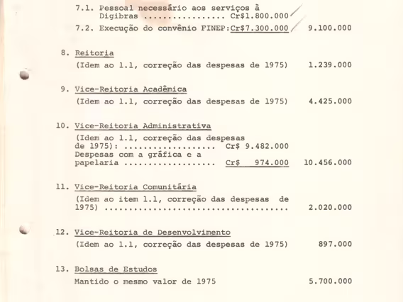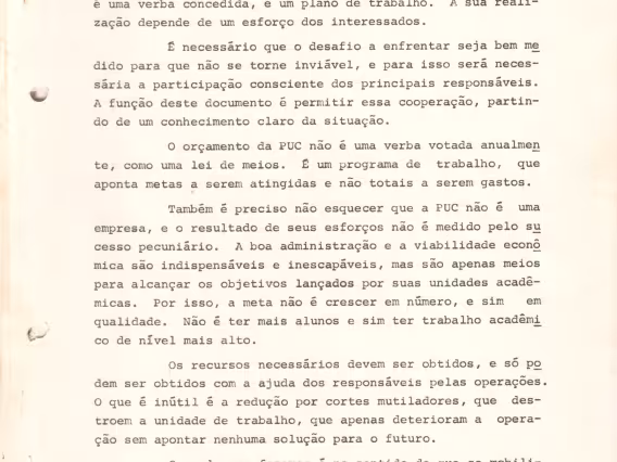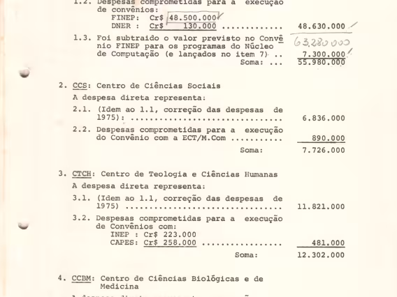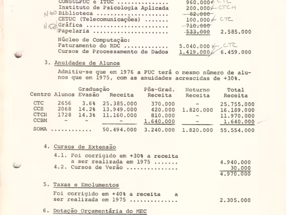 Proposta para o orçamento da PUC de 1976, com pequenos comentários sobre as áreas de trabalho, correspondentes aos centros (CCS, CTC, CTCH e CCBM). Há correções à lápis.