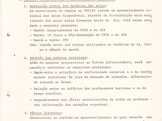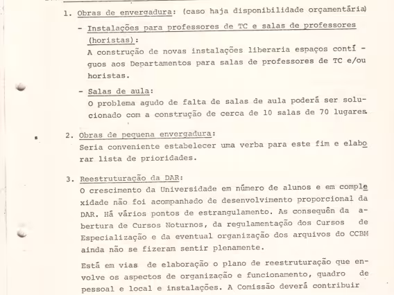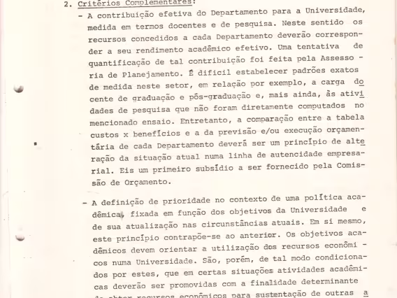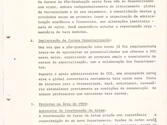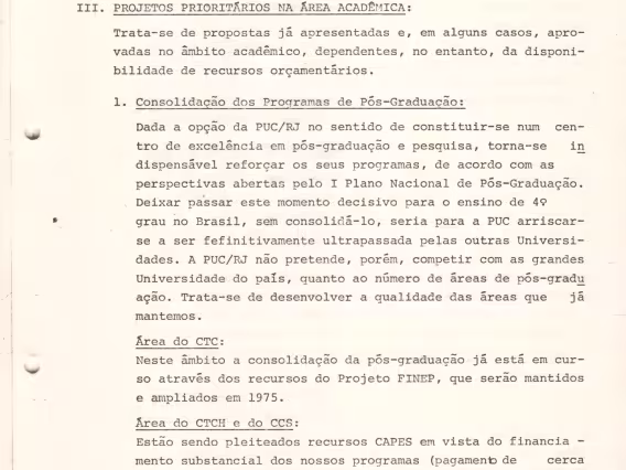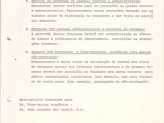 Estudo elaborado pelo Vice-reitor para Assuntos Acadêmicos, pe. João Augusto Mac Dowell S.J., para o planejamento acadêmico da PUC-Rio para o ano de 1976. O documento avalia a política acadêmica da Universidade, apresenta critérios para a distribuição dos recursos orçamentários entre as áreas, indica propostas para consolidação dos programas de Pós-Graduação e para a implantação de novos departamentos, cursos de mestrado, doutorado e de especialização. O estudo aponta também para a necessidade de construção de novas instalações - salas de aula e de professores -, da reestruturação da DAR, implementação de coordenação própria para os cursos noturnos, criação de um Centro de Recursos Audiovisuais, instalação de um museu no Solar Grandjean de Montigny e da automatização da Divisão de Bibliotecas e Documentação. Ao final, o documento indica propostas para elaboração de estudo sobre a distribuição racional das salas de aula, a revisão das tabelas salariais dos professores, e o estabelecimento de um período para férias coletivas - dezembro e janeiro - e para promoção do corpo docente e administrativo. O estudo foi enviado através do ofício OF.GT-21/75 pelo presidente do Grupo de Trabalho, prof. Antonio Ernesto Camargo Wanderley, ao prof. Paulo Novaes.