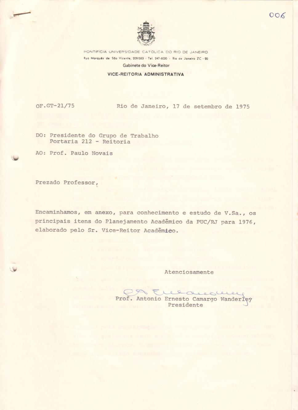 Estudo elaborado pelo pe. João Augusto Mac Dowell S.J. para o planejamento acadêmico da PUC-Rio de 1976. O documento avalia a política acadêmica da Universidade, apresenta critérios para a distribuição dos recursos orçamentários entre as áreas, indica propostas para consolidação dos programas de Pós-Graduação e para a implantação de novos departamentos, cursos de Mestrado, Doutorado e de Especialização. O estudo aponta também para a necessidade de construção de novas instalações - salas de aula e de professores -, da reestruturação da DAR, implementação de coordenação própria para os cursos noturnos, criação de um Centro de Recursos Audiovisuais, instalação de um museu no Solar Grandjean de Montigny e da automatização da Divisão de Bibliotecas e Documentação. Ao final, o documento indica propostas para elaboração de estudo sobre a distribuição racional das salas de aula, a revisão das tabelas salariais dos professores, e o estabelecimento de um período para férias coletivas - dezembro e janeiro - e para promoção do corpo docente e administrativo. O estudo foi enviado através do ofício OF.GT-21/75 pelo presidente do Grupo de Trabalho, prof. Antonio Ernesto Camargo Wanderley, ao prof. Paulo Novaes.
