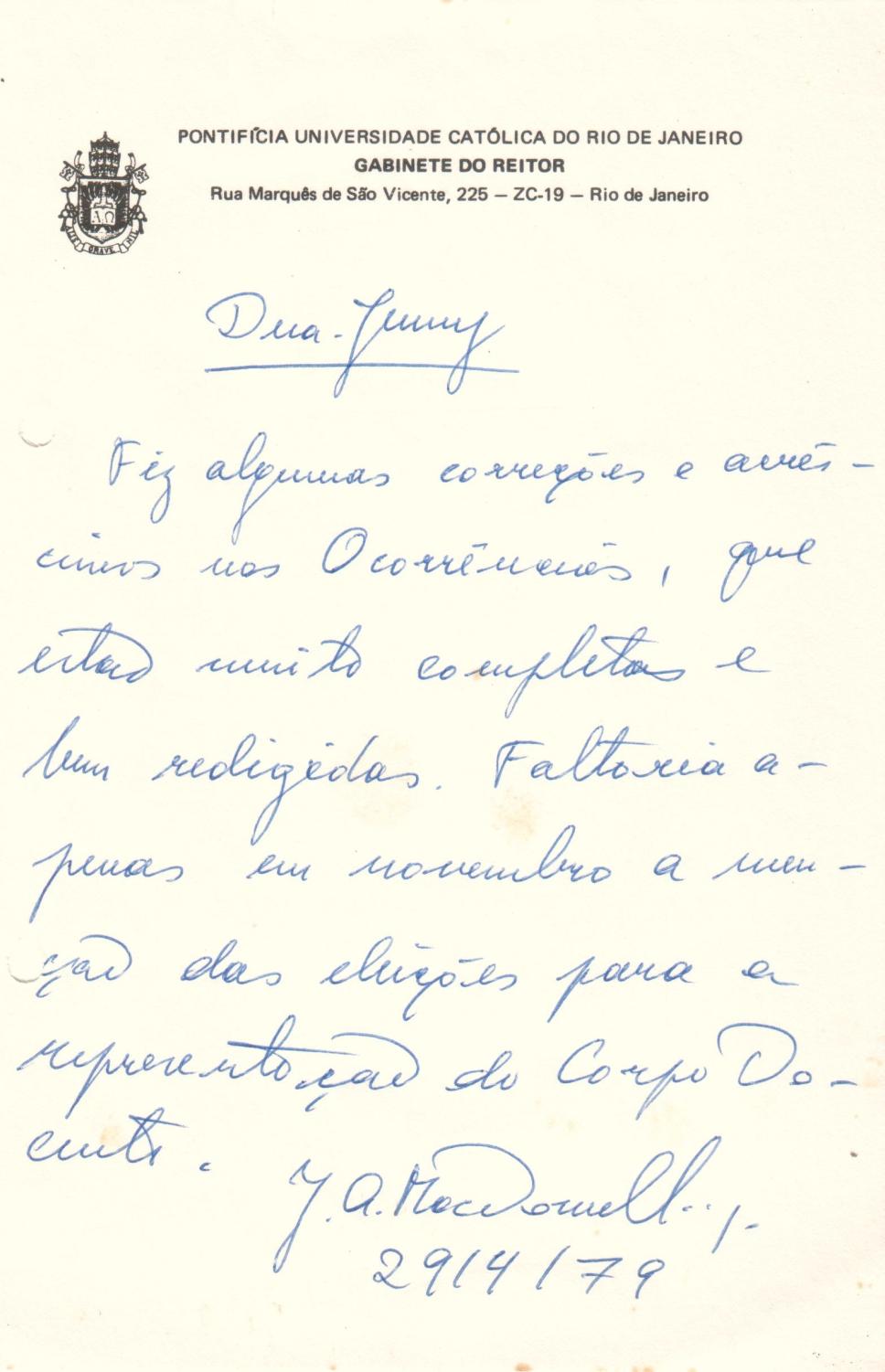 Carta do reitor padre Mac Dowell S.J. à funcionária Jenny Valle Mascarenhas. O reitor solicita correções no item Ocorrência para incluir informações a respeito das eleições para a representação do corpo docente.