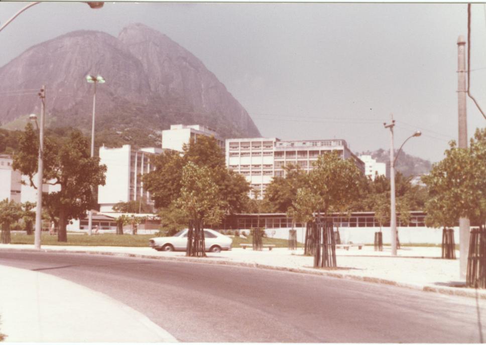 Vista da PUC (prédios Leme e Frings) a partir da curva de saída da rua Marquês de São Vicente para a rua Vice-Governador Rubens Berardo, em frente ao Planetário. Ao fundo, o morro Dois Irmãos.