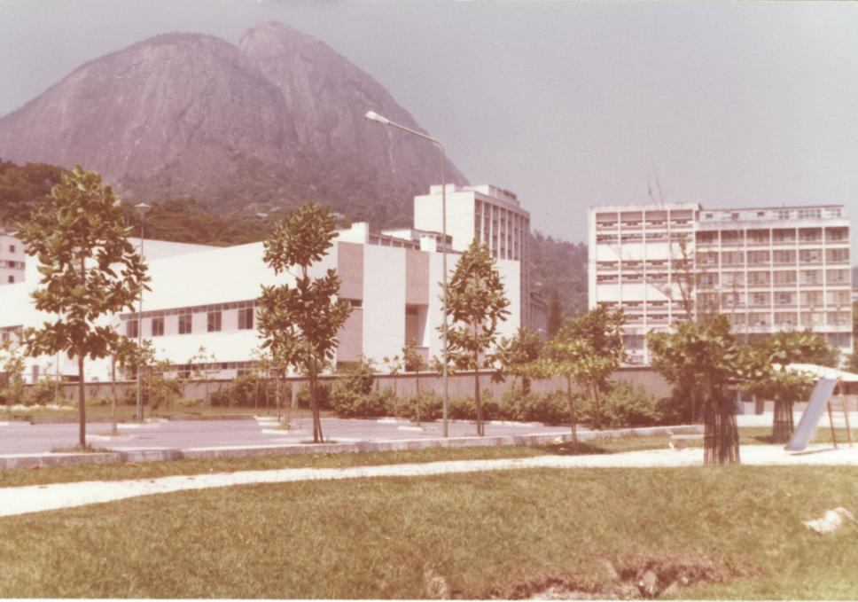 Vista da PUC-Rio (prédios Leme e Frings) a partir do estacionamento do Planetário. Ao fundo, o morro Dois Irmãos.