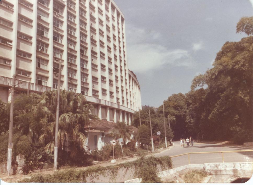 Vista do Edifício Cardeal Leme a partir da via central de entrada no campus. À esquerda veem-se as casinhas remanescentes de uma das vilas anteriores ao campus, inclusive a casa ocupada até hoje pela CCE.