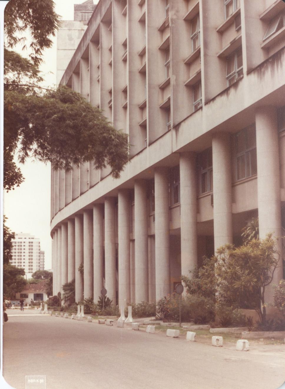 Vista externa do Ed. Cardeal Leme. As vagas de estacionamento em diagonal haviam sido bloqueadas com blocos de cimento. Ao fundo, a casa da CCE.