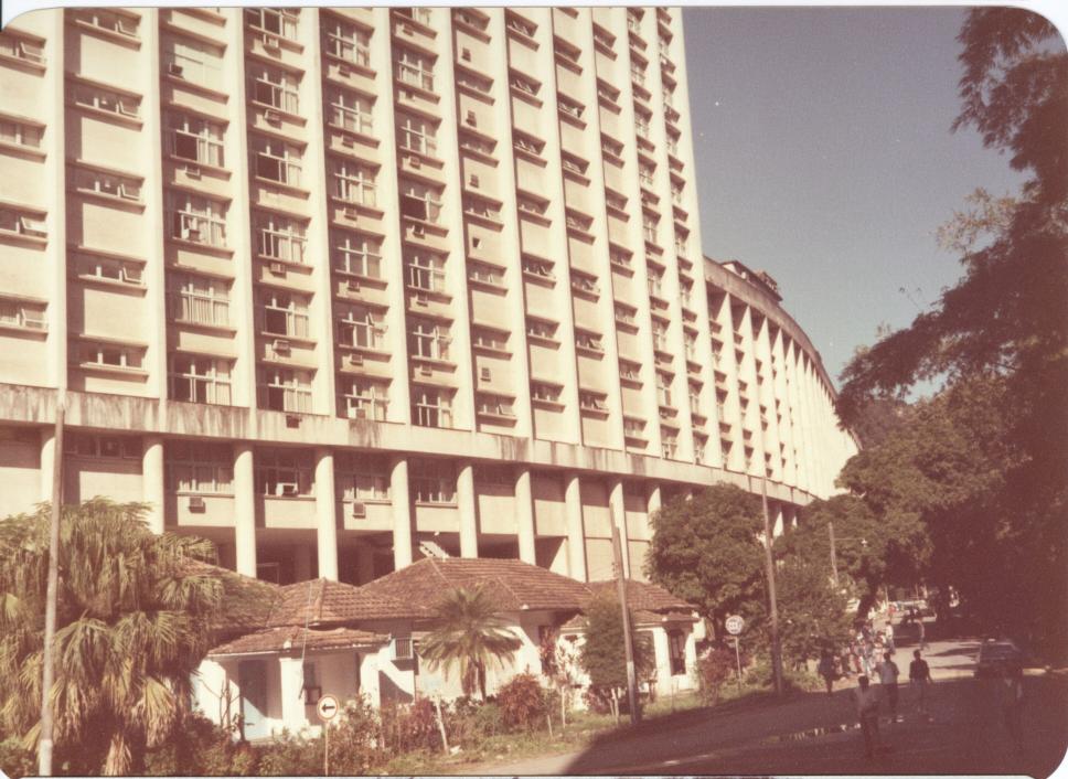 Vista da fachada do Edifício Cardeal Leme, tendo em primeiro plano as casas remanescentes de uma das vilas anteriores ao campus. A casa da direita, com um letreiro em um poste, é a casa até hoje ocupada pela CCE.