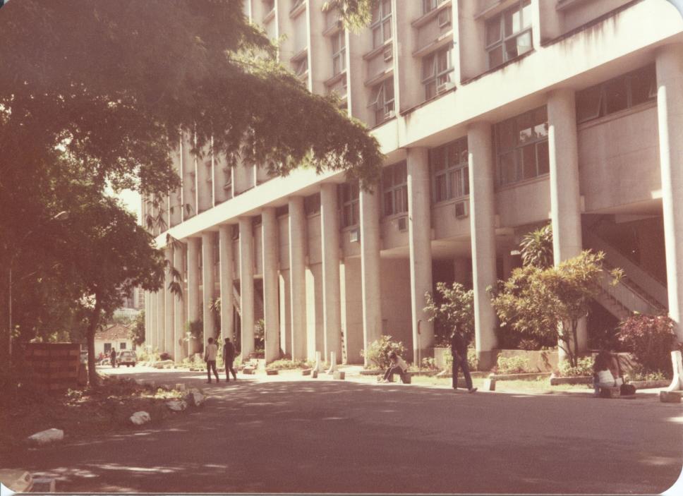Fachada do Edifício Cardeal Leme, já com diversos aparelhos de ar condicionado. As vagas de carros para estacionamento na diagonal estavam bloqueadas por blocos de concreto.