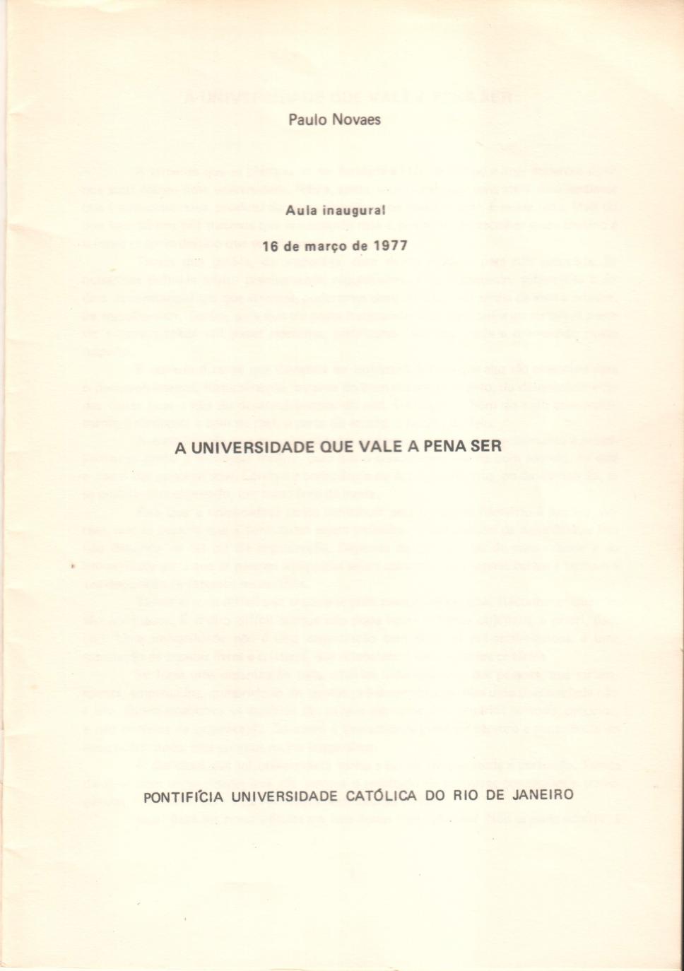 Página de abertura do texto apresentado pelo prof. Paulo Novaes na Aula Inaugural de 1977.