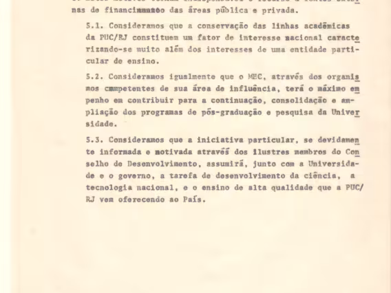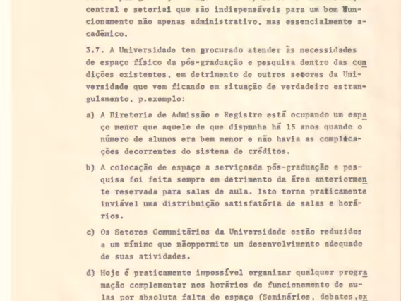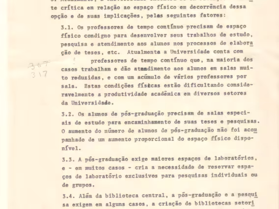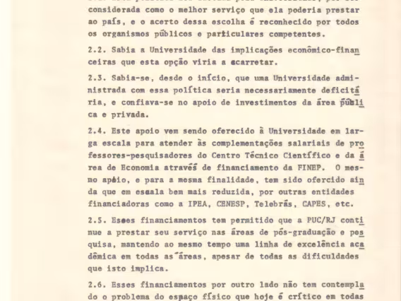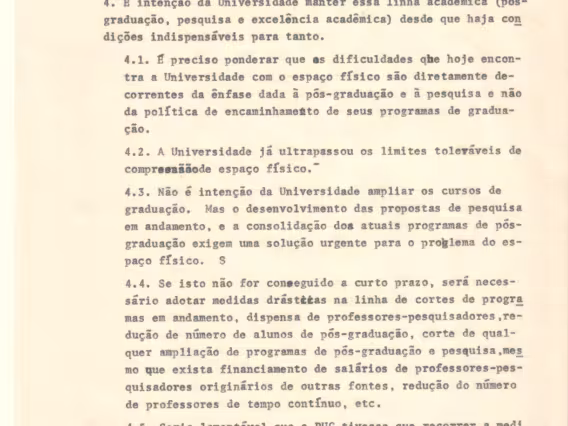 Carta e relatório anexo sobre as demandas e as possibilidades de atendimento em relaçao ao espaço físico necessário para os programas de pós-graduação. São apresentadas as características da pós e da pesquisa na PUC e discutida a necessidade de fontes de financiamento externas para atender às reinvinicações.