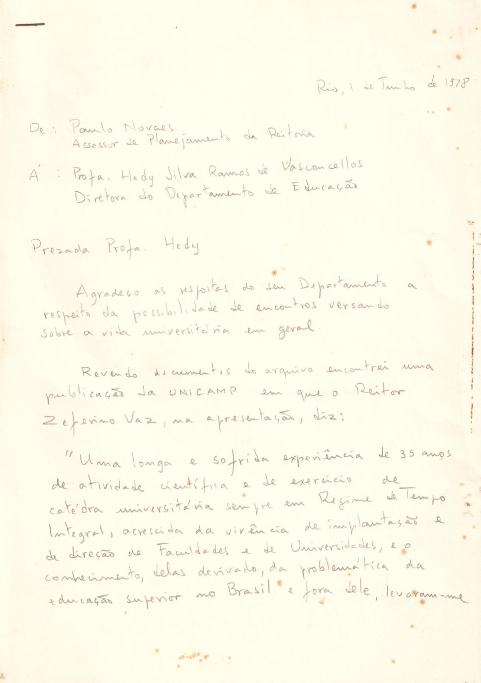 Rascunho de carta do Prof. Paulo Novaes à Profa. Hedy Silva Ramos (EDU).