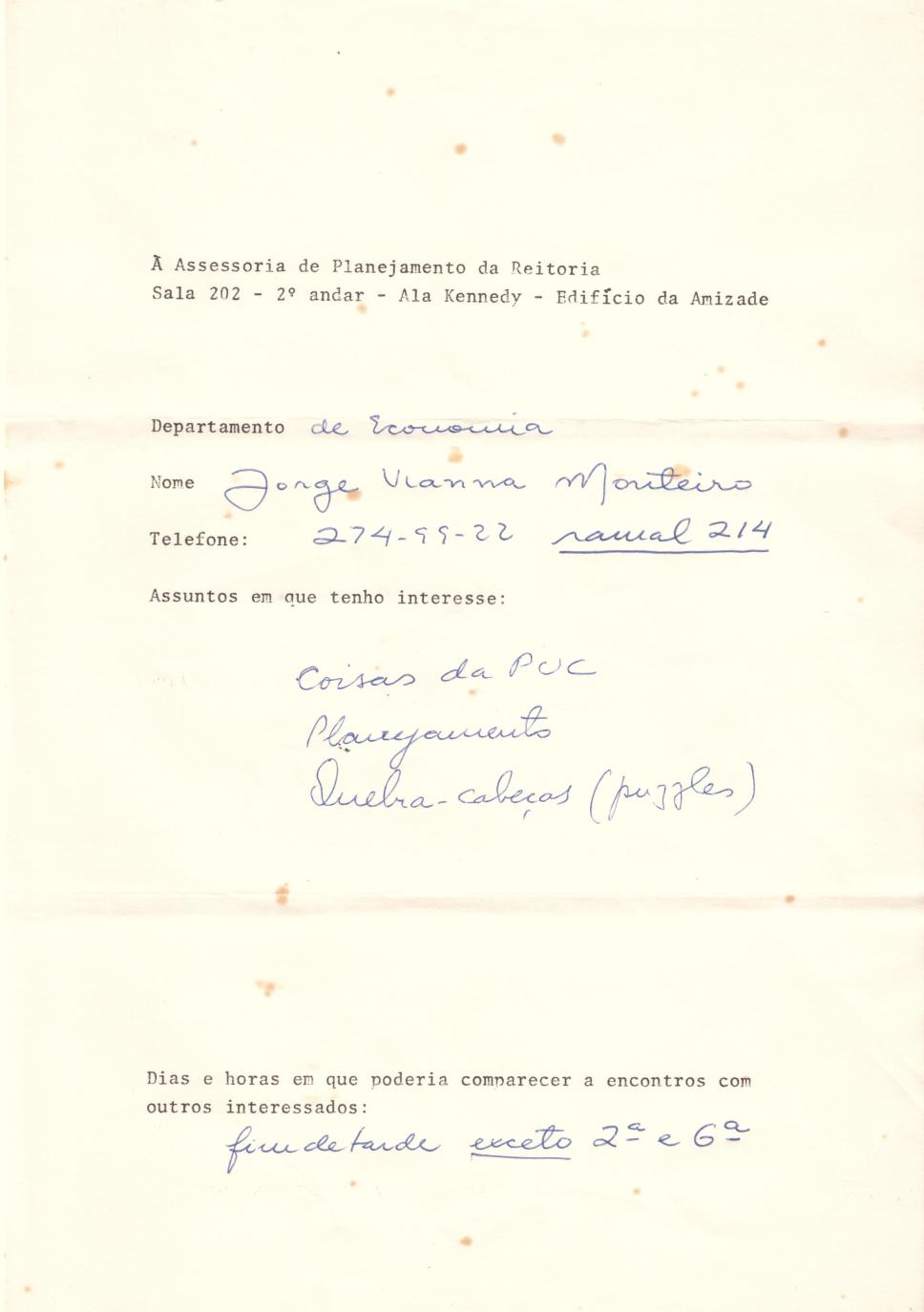 Ficha de Jorge Vianna Monteiro, com interesses para discussão no contexto universitário.
