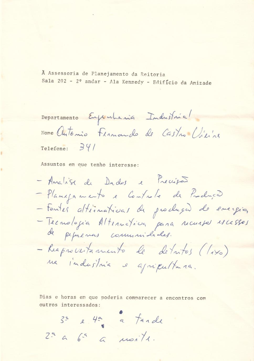 Ficha de Antonio Fernando de Castro Vieira, com interesses para discussão no contexto universitário.