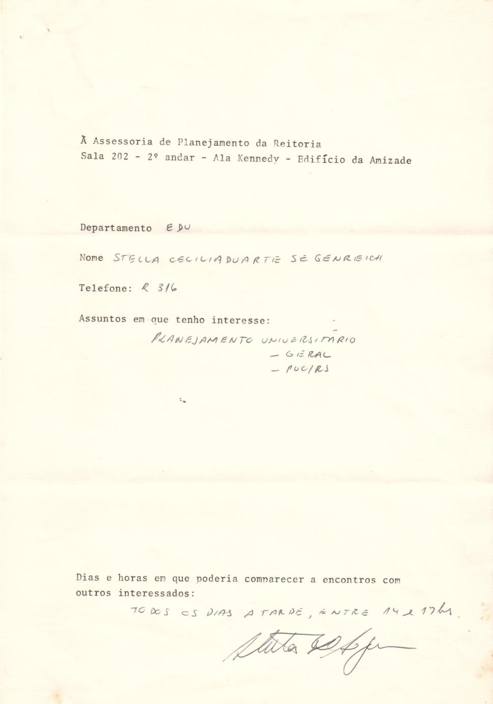 Ficha da profa. Stella Segenreich, em pesquisa da Assessoria de Planejamento da Reitoria, sobre os interesses para discussão no contexto universitário.