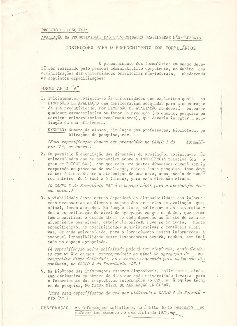 Coleção Pesquisa Institucional do Conselho de Reitores das Universidades Brasileiras - CRUB Código exclusivo cg0040_003 Data da criação Ano 1980 Data de criação Ter, 01/01/1980 - 12:00 Referente a Departamento de Psicologia (PSI) Identificação Original Circular CRUB BSB/041/80 Descrição Instruções de preenchimento dos questionários