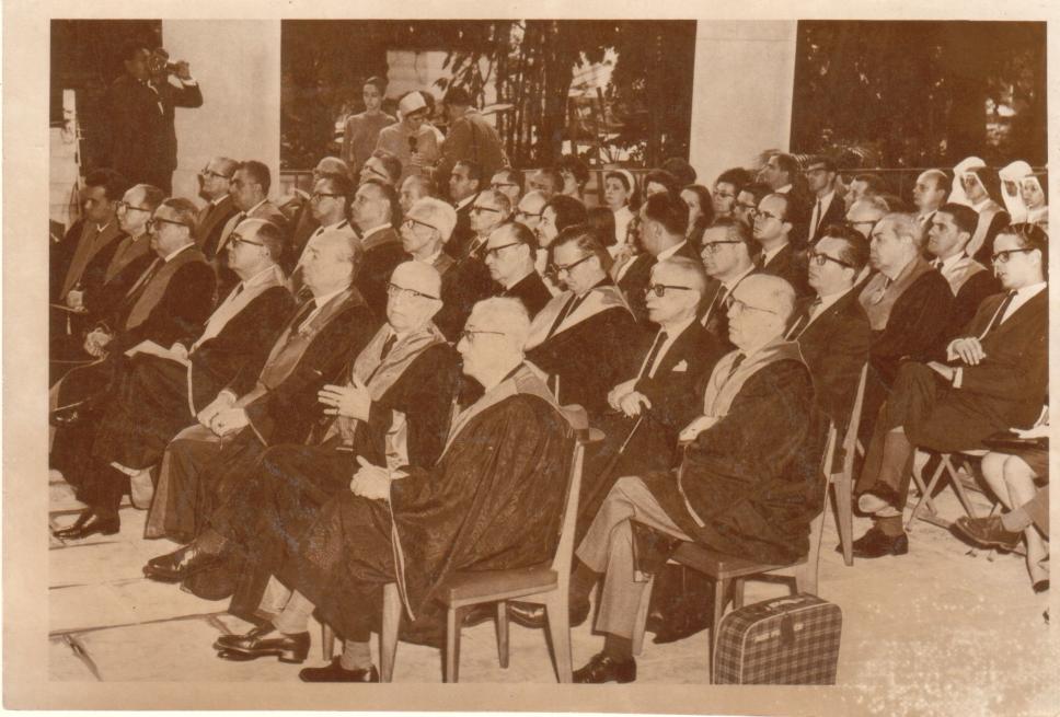 Plateia presente na comemoração do Jubileu de Prata da PUC-Rio. Na ocasião, com a presença do Embaixador da Alemanha Ocidental, foi inaugurado o prédio da Biblioteca Central, ainda em obras, e houve a entrega das medalhas Cardeal Leme aos professores e o descerramento das placas aos benfeitores.