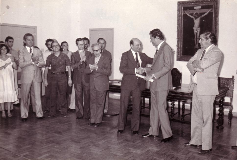 Heitor Herrera, Pe.Agostinho Castéjón, S.J., Pe.José Mendes, S.J. Pe.Velloso, Pe.Mac Dowell,S.J., Ronaldo Barcelos de Pinho, ao fundo, Lígia, Elis, Sérgio, Ronaldo Barcelos de Pinho