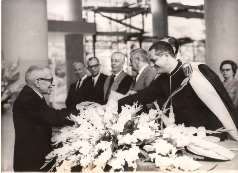 O reitor pe. Laércio entrega o diploma e a medalha Cardeal Leme no evento comemorativo do Jubileu de Prata da PUC-Rio. Na ocasião, com a presença do Embaixador da Alemanha Ocidental, foi inaugurado o prédio da Biblioteca Central, ainda em obras, e houve o descerramento das placas aos benfeitores..