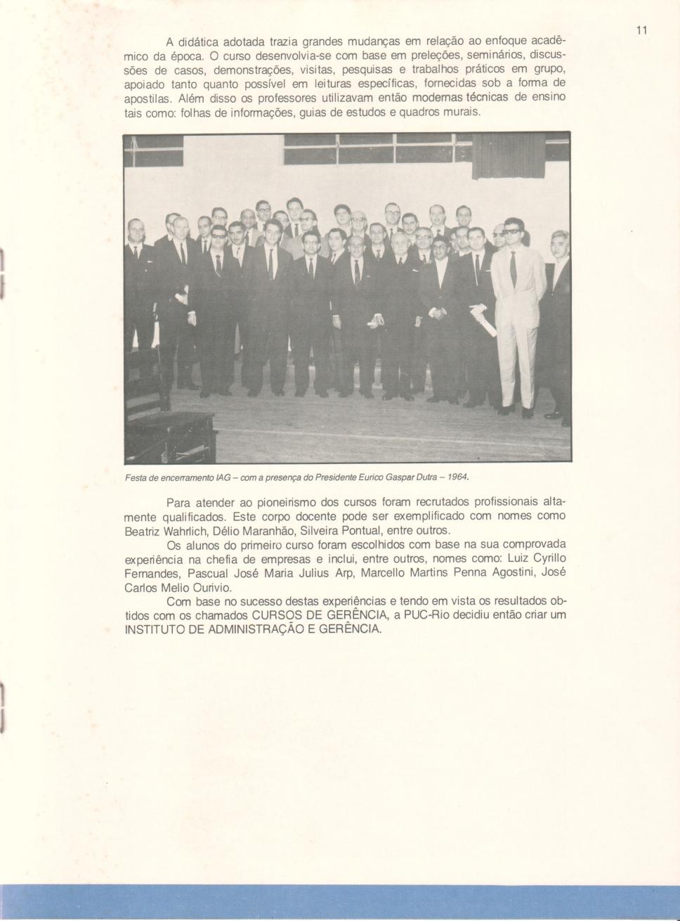 A festa encerramento do ano de 1964 no IAG, com foto da festa. Presença do presidente Marechal Eurico Gaspar Dutra. O texto contém o nome de professores e alunos que fizeram parte da primeira turma do IAG.