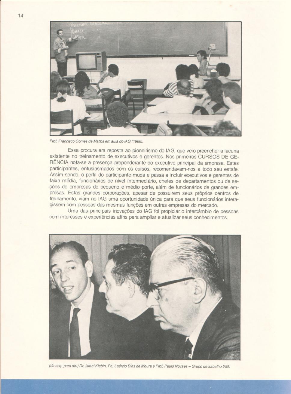 Fotos de uma sala de aula do IAG, 1988, e de grupo de trabalho do IAG, composto pelo pe. Laércio Dias Moura, S.J., engenheiro Israel Klabin e prof. Paulo Novaes.