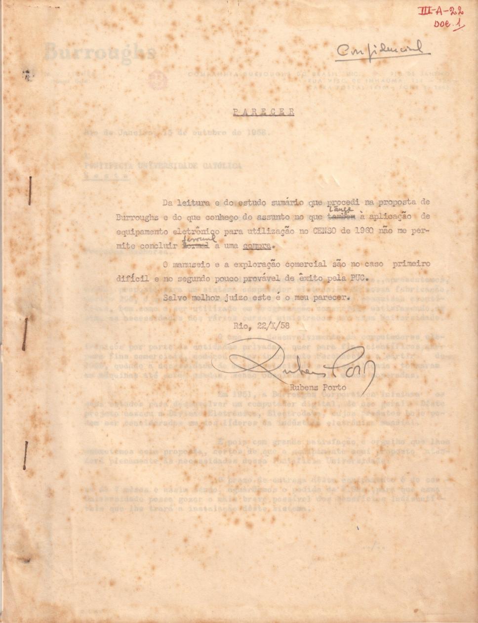 Parecer de Rubens Porto, contrário à compra pela PUC-Rio do computador Burroughs 205 para uso no Censo 1960. Documento datilografado e corrigido manualmente a lápis. Importante para história da compra do primeiro computador de grande porte para uso acadêmico na América Latina. Rubens Porto foi arquiteto, funcionário do Ministério do Trabalho e presidente Confederação Nacional dos Operários Católicos na década de 1930. Provavelmente era assessor da Reitoria.