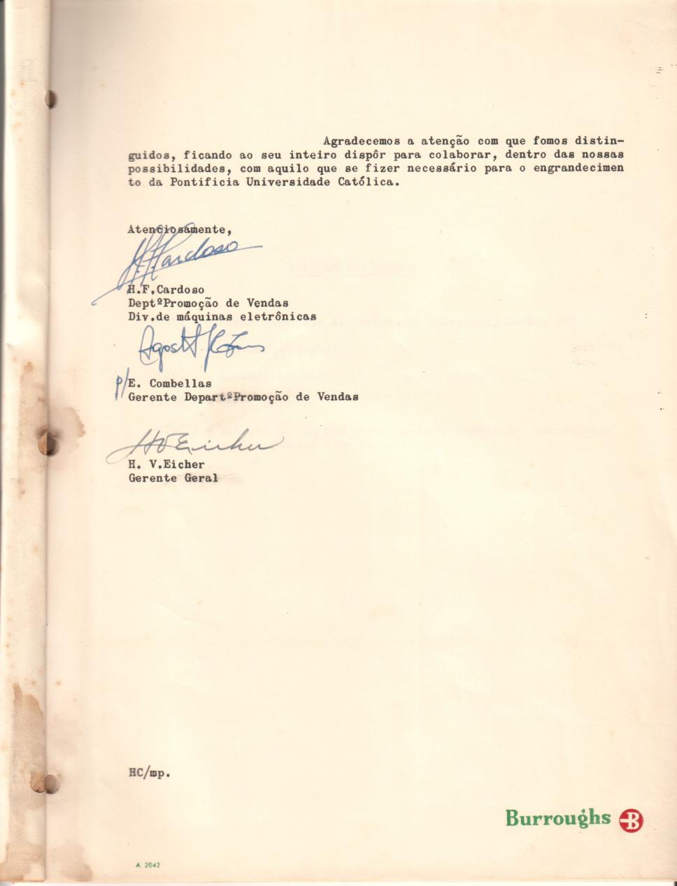 Verso da proposta da Burroughs à PUC-Rio, endereçada ao Diretor da Escola Politécnica (Carlos Alberto del Castilho) sobre a venda de um computador modelo 205. Verso de documento fundamental para a história da compra do primeiro computador de grande porte para uso acadêmico na América Latina. Papel timbrado da Burroughs.