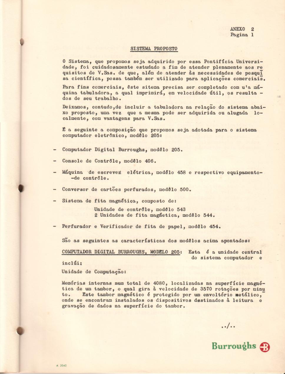 Anexo 2 à proposta da Burroughs à PUC-Rio, endereçada ao Diretor da Escola Politécnica (Carlos Alberto del Castilho) sobre a venda de um computador modelo 205. Diz respeito as características técinicas do equipamento. Memória interna com 4080 unidades, em tambor que gira a 3570 rpm.