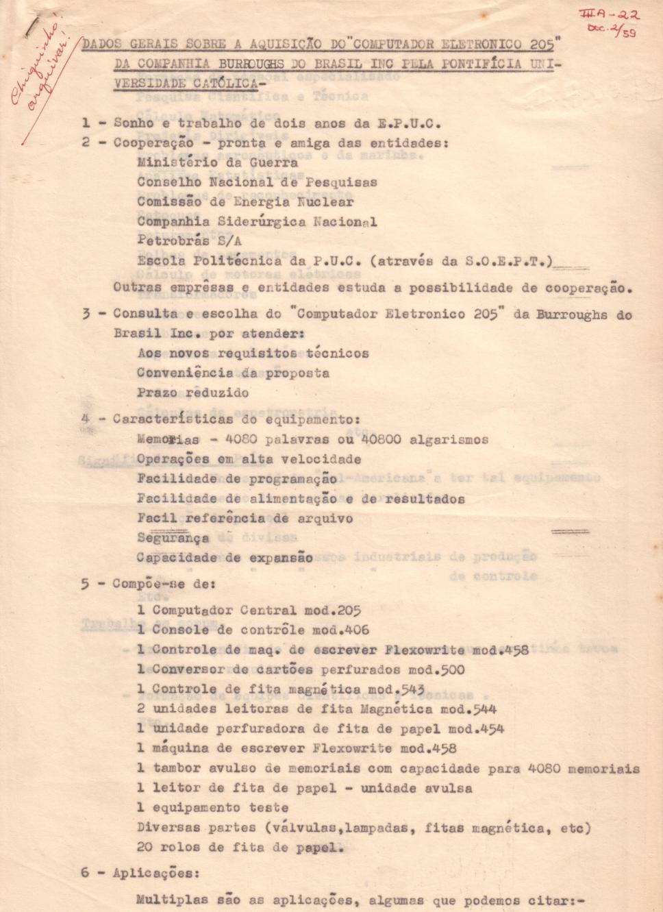 III-A-22 doc.2/59 - 1959 - Dados gerais sobre a aquisição do “Computador Eletrônico 205”